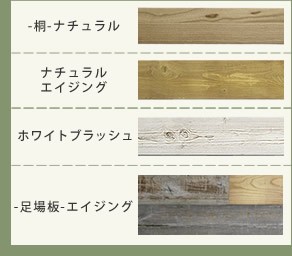 | ナチュラルシリーズ:ナチュラルエイジング、-足場板-エイジング、-桐-ナチュラル、ホワイトブラッシュ |