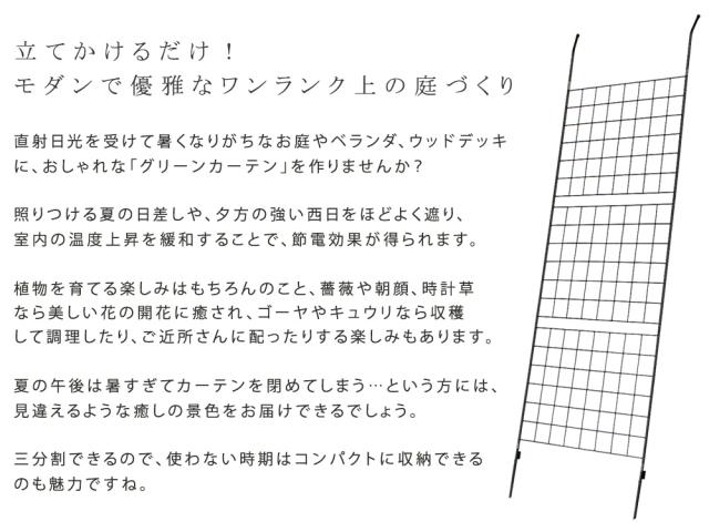 | 立てかけるだけ! モダンで優雅なワンランク上の庭づくり直射日光を受けて暑くなりがちなお庭やベランダ、ウッドデッキに、おしゃれな「グリーンカーテン」を作りませんか? 照りつける夏の日差しや、夕方の強い西日をほどよく遮り、室内の温度上昇を緩和することで、節電効果が得られます。 植物を育てる楽しみはもちろんのこと、薔薇や朝顔、時計草なら美しい花の開花に癒され、ゴーヤやキュウリなら収穫して調理したり、ご近所さんに配ったりする楽しみもあります。 夏の午後は暑すぎてカーテンを閉めてしまう…という方には、見違えるような癒しの景色をお届けできるでしょう。 三分割できるので、使わない時期はコンパクトに収納できるのも魅力ですね。 |