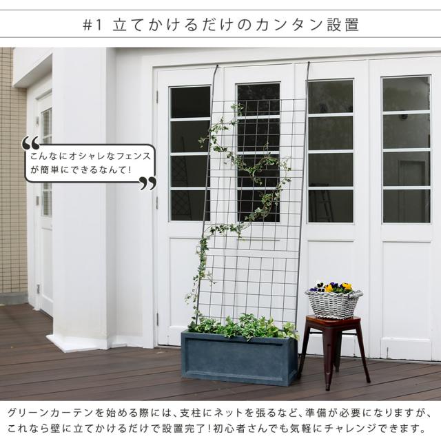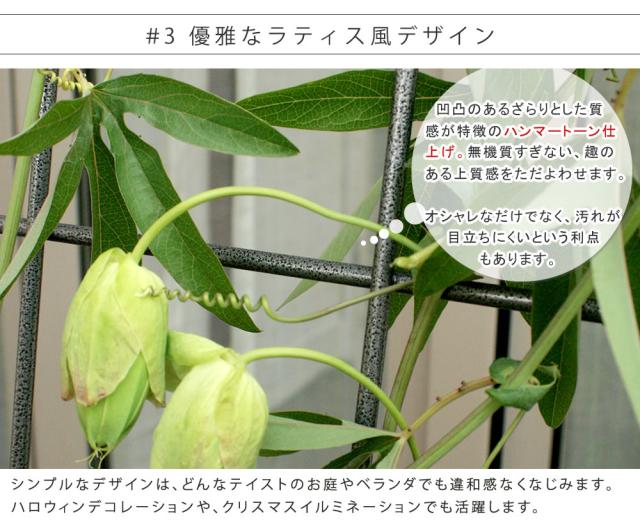 | 立てかけるだけ! モダンで優雅なワンランク上の庭づくり直射日光を受けて暑くなりがちなお庭やベランダ、ウッドデッキに、おしゃれな「グリーンカーテン」を作りませんか? 照りつける夏の日差しや、夕方の強い西日をほどよく遮り、室内の温度上昇を緩和することで、節電効果が得られます。 植物を育てる楽しみはもちろんのこと、薔薇や朝顔、時計草なら美しい花の開花に癒され、ゴーヤやキュウリなら収穫して調理したり、ご近所さんに配ったりする楽しみもあります。 夏の午後は暑すぎてカーテンを閉めてしまう…という方には、見違えるような癒しの景色をお届けできるでしょう。 三分割できるので、使わない時期はコンパクトに収納できるのも魅力ですね。 |