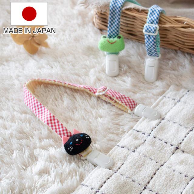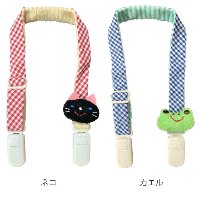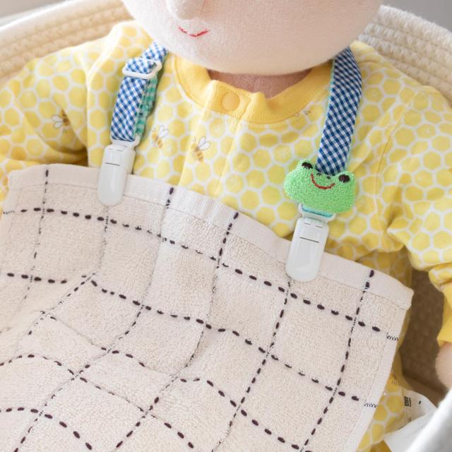 両端についたクリップで、ハンカチやタオルの端を挟めばスタイ、エプロンとしてお使いいただけます。アジャスターが付いているので、長さの調節もできます。お子さまの肌にあたる部分は柔らかいパイル地なので安心です。