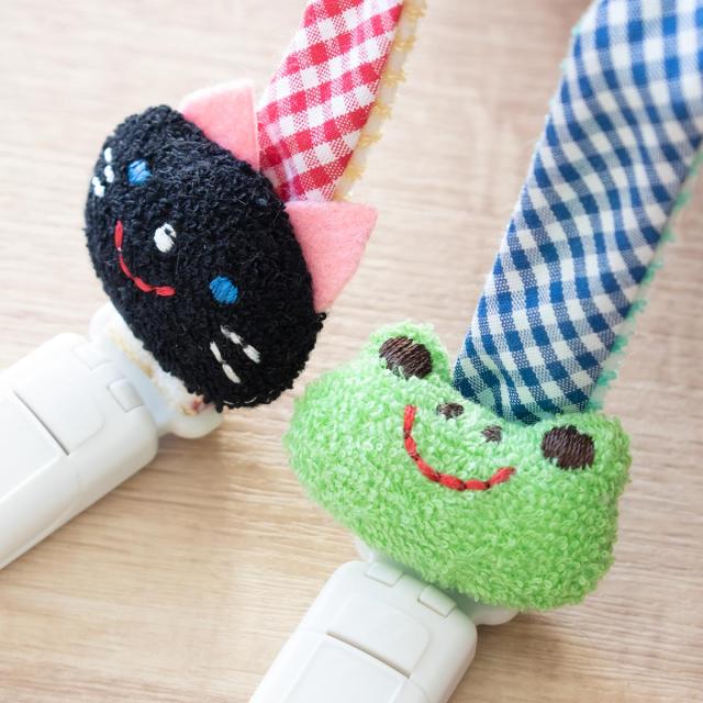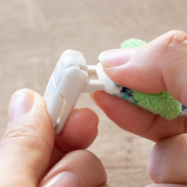 ハンカチやタオルを傷つけにくいプラスチック製のクリップです。クリップ部分を折るようにして開閉させ、簡単に挟むことができます。しっかりと留まるのでお子さまが引っ張っても大丈夫、おもちゃホルダーとしてもお使いいただけます。