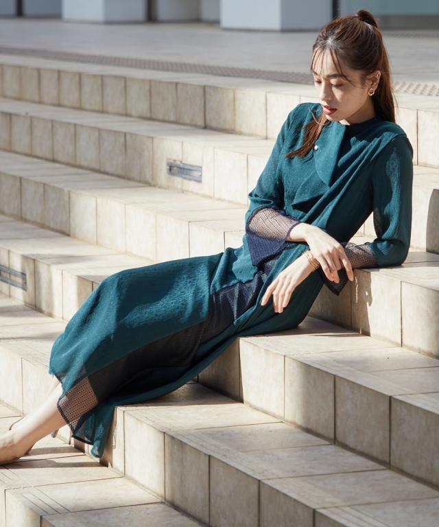 ドレス ワンピース レディース 結婚式 パーティー オケージョン Callarus Front Deign Lace×Jacquard Onepiece Dress 有 グリーン系/黒系 LL/3L ニッセン nissen