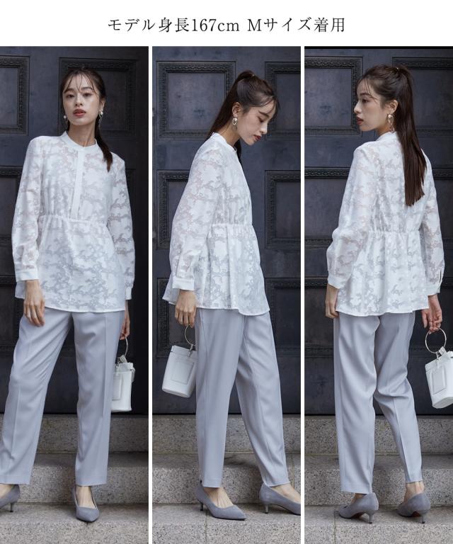 品質=<ジャケット・パンツ>[表地]ポリエステル95%・ポリウレタン5%(織物)<ブラウス>[別布A]ポリエステル55%・レーヨン45%・[別布B]ポリエステル100%(織物) 【裏地】ジャケット(総裏):有 ブラウス、パンツ:無ブラウス:前ボタン開 袖口ボタン開 ウエストゴム入ジャケット:前ホック開 袖口ファスナー開 パンツ:前ファスナー内ホック開 ウエスト後ゴム入 両脇ポケット ※ブラウス:柄の出方が多少異なる場合があります。 ※この商品は3点同サイズのみで販売します。 ※透ける素材です。着用時はキャ