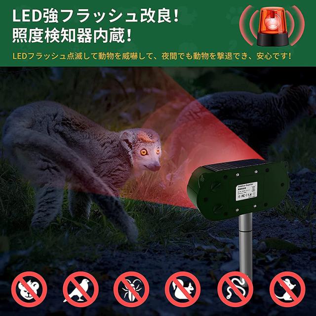 【動物撃退器】本商品は赤外線センサーがトリガーされ、赤いLEDが点灯し、超音波、音声、および2色のライトの強いフラッシュを放出します。動物を不快に感じさせ、動物を撃退されます。