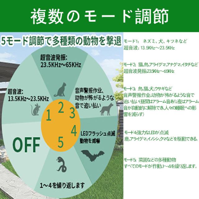 ●モード4:強力なLEDが点滅し、鹿、アライグマ、イノシシ、クマなどを駆動できます。●モード5:1〜5チャンネルで、可変周波数の音声と強力なLEDの点滅で、すべての動物を撃退します。夜間:音声アラーム機能を自動解除、人々の睡眠への影響を減らす。