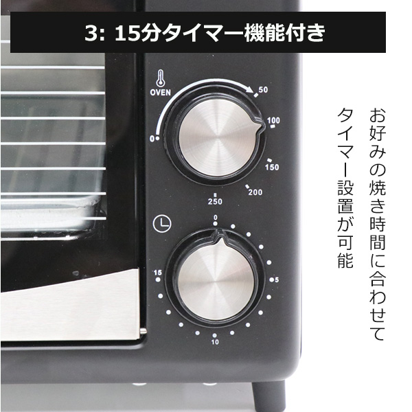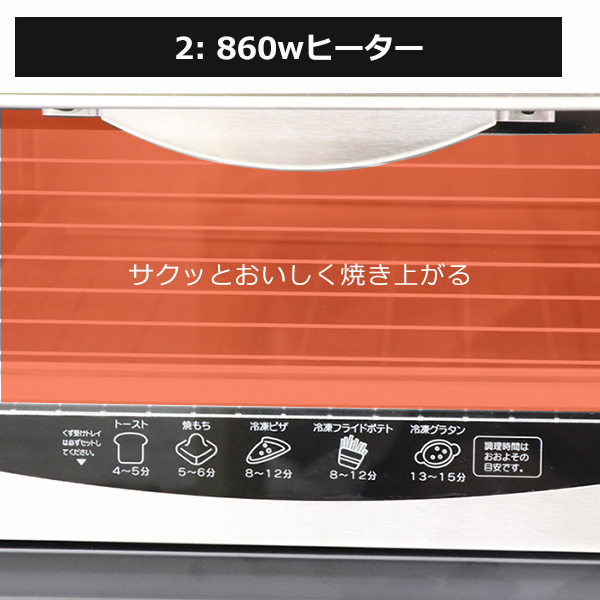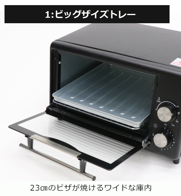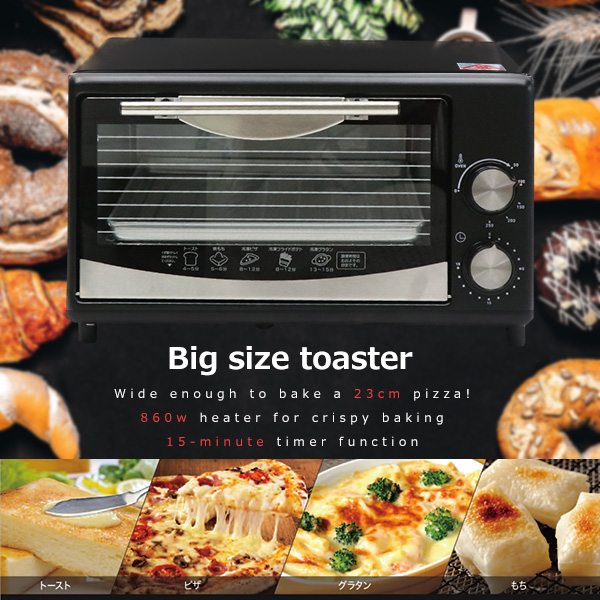 | 商品説明 | ピザも焼けるワイドサイズ 23cmのピザが焼けるワイドな庫内! 860wヒーターでサクッと焼ける 15分タイマー機能付き ■商品詳細 本体サイズ:約幅352×高さ205×奥行265mm 本体重量:約2.65kg 庫内サイズ:約幅250×高さ165×奥行243mm 受皿サイズ:約幅240×高さ15×奥行235mm 【仕様】 電源:AC100V 消費電力:860W コード長:約0.8m 安全装置:サーモスタット |