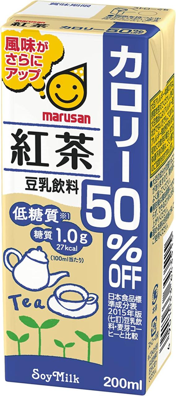 標準的な豆乳飲料(日本食品標準成分表2010豆乳飲料麦芽コーヒー)と比較し、カロリーを50%オフしました。ミルクティーのようなコクや甘みを感じられるカロリー50%オフの紅茶味の豆乳飲料です。豆乳飲料は甘くて好きだけど、カロリーが気になる・・・そんな方にお勧めできる豆乳飲料です。