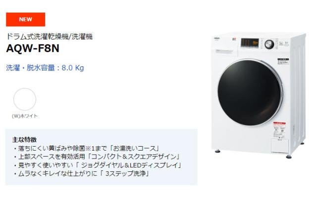 AQUA アクア 【まごころ配送】【標準配送設置無料!】AQW-F8N-W(ホワイト) ドラム式洗濯機【洗濯・脱水容量:8.0 Kg】