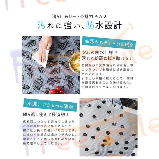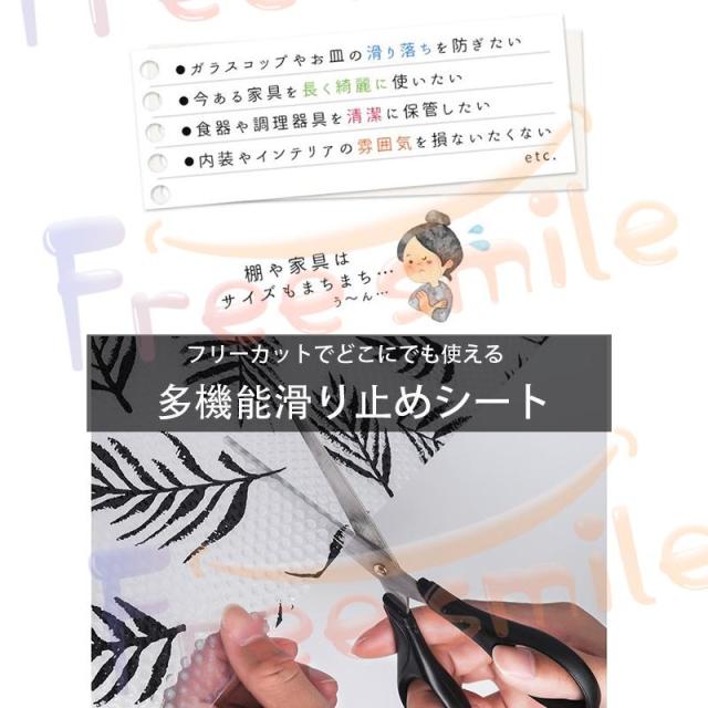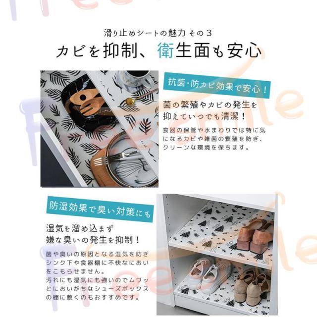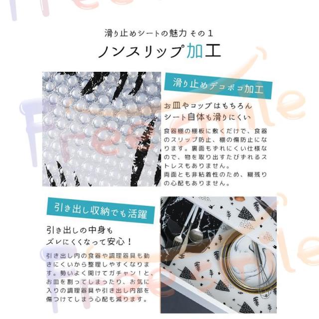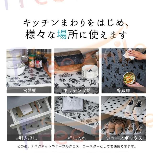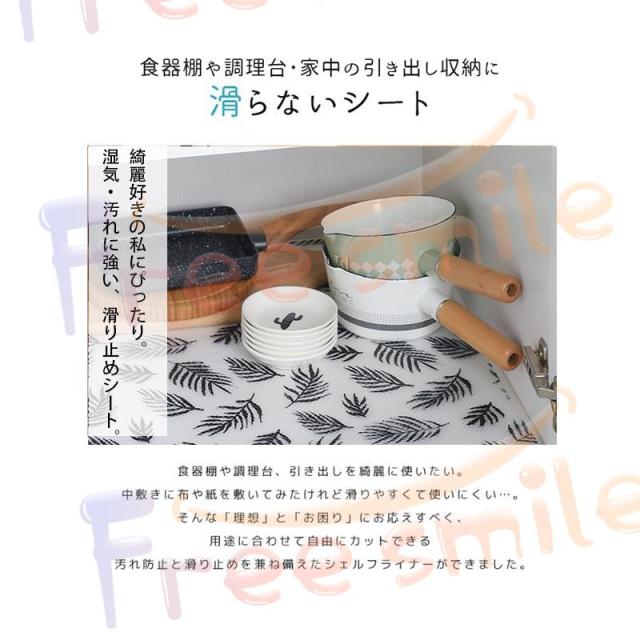 設置場所に合わせて好きなサイズにカットできるので、キッチンの食器棚や冷蔵庫はもちろん、押し入れ、下駄箱など、様々な場所で使えるシェルフライナーです。