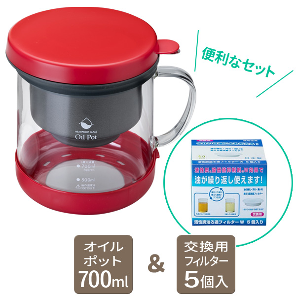 セット内容耐熱ガラス製 活性炭油ろ過ポットW レッド(KWP-GN-R) 、交換フィルターW 5枚入(KWF-5P)