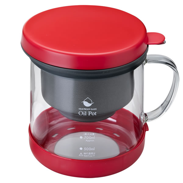 耐熱ガラス製 活性炭油ろ過ポット + 交換フィルター セット レッド KWP-GN + KWF-5P | 油 ろ過 活性炭 ポット&フィルター セット オイル 新鮮 日本製 交換用フィルター セット 二重口 酸化値抑制 酸化防止 汚れ 臭い 防止
