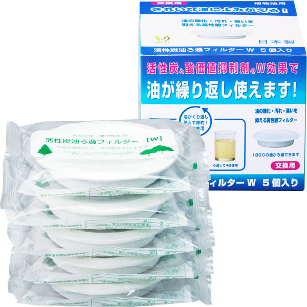 活性炭と酸価値抑制剤のダブル効果で油がくり返し使える油ろ過ポットと交換用フィルター(5枚入り)のセット。