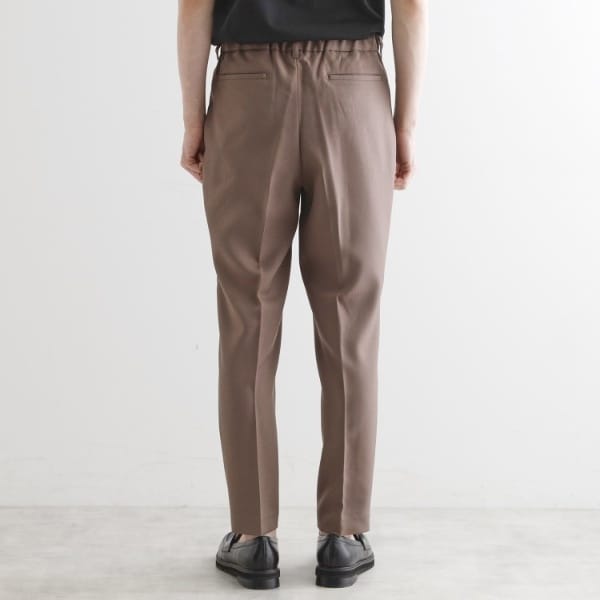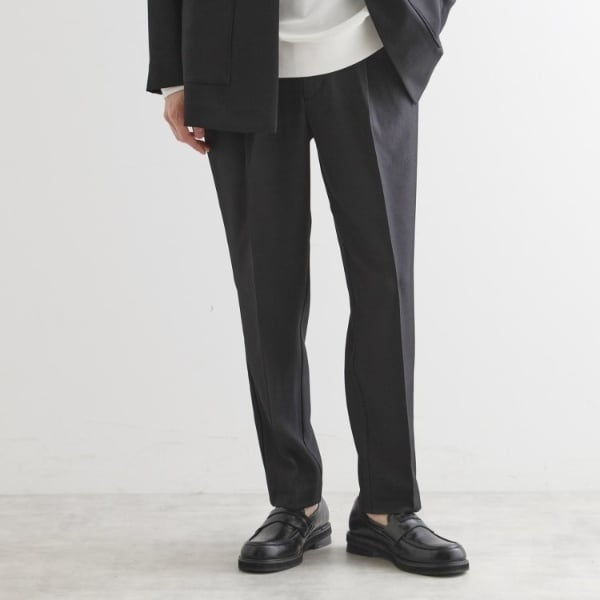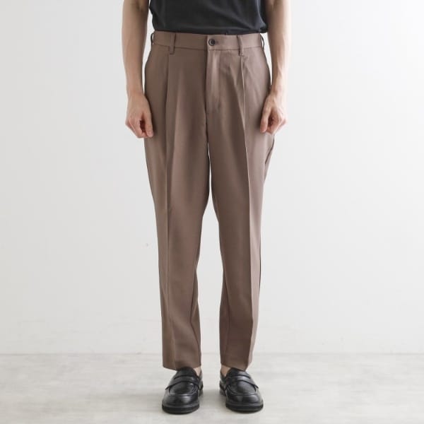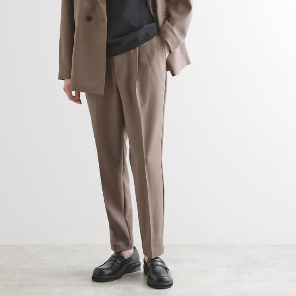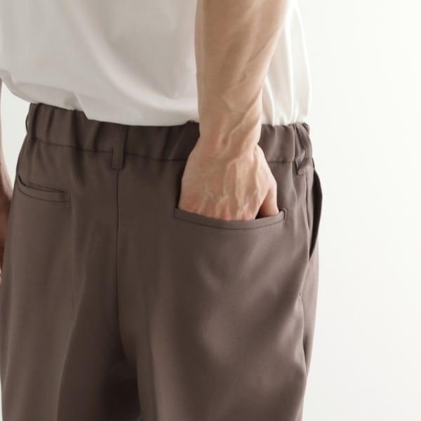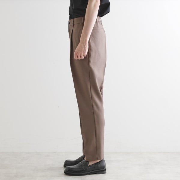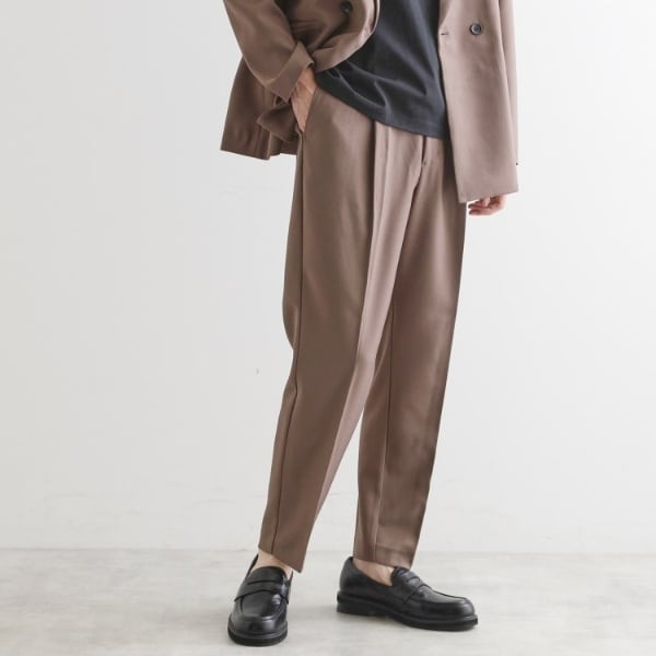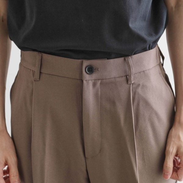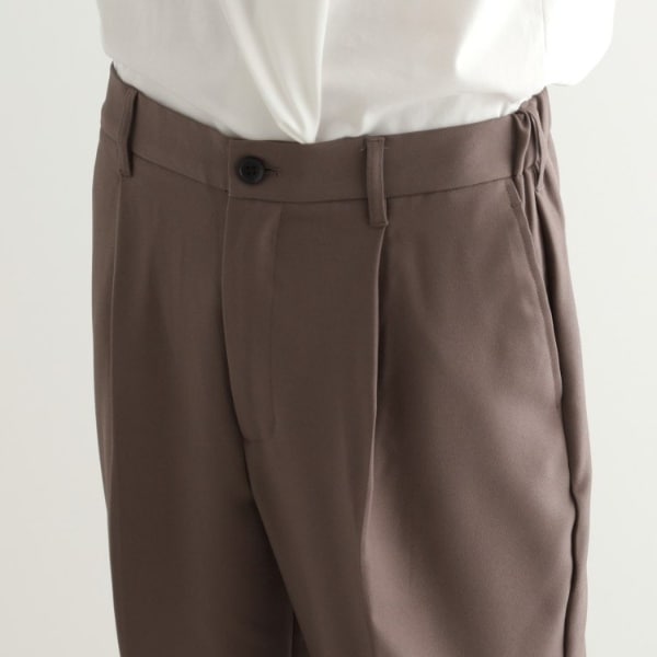 1タックを入れヒップ周りに適度なゆとりを持たせつつ、裾に向かって細くなるワイドテーパードシルエット。