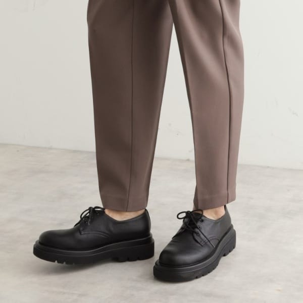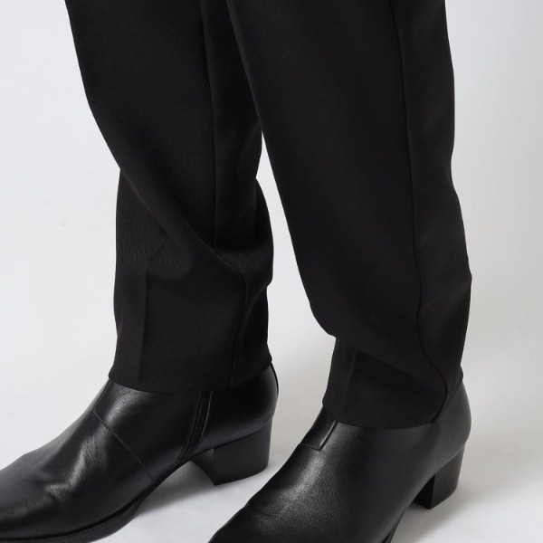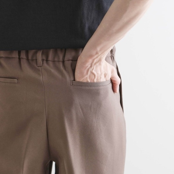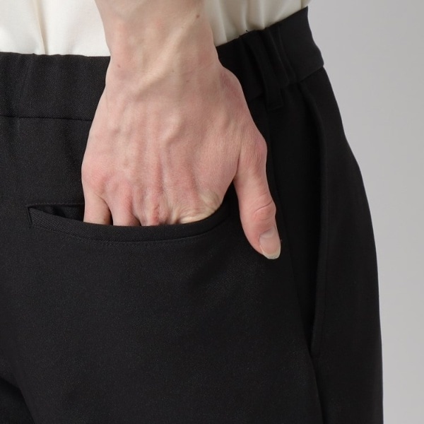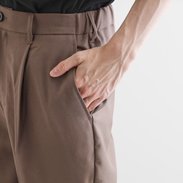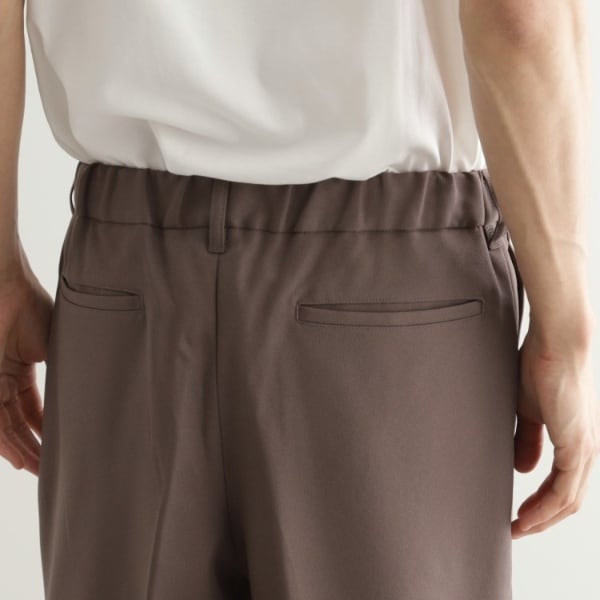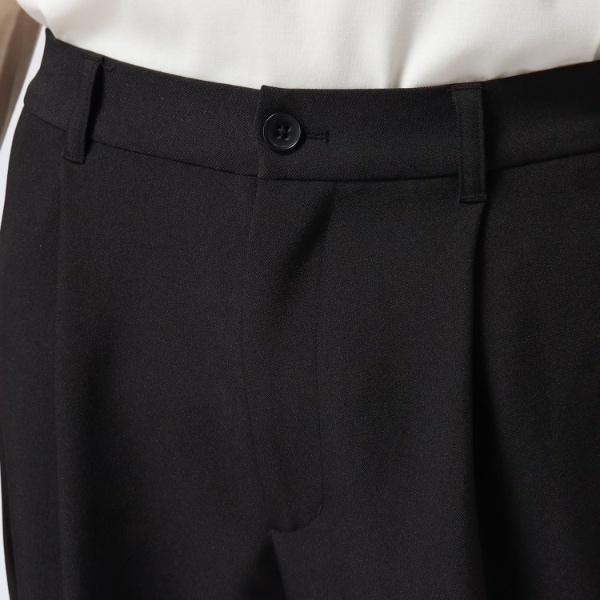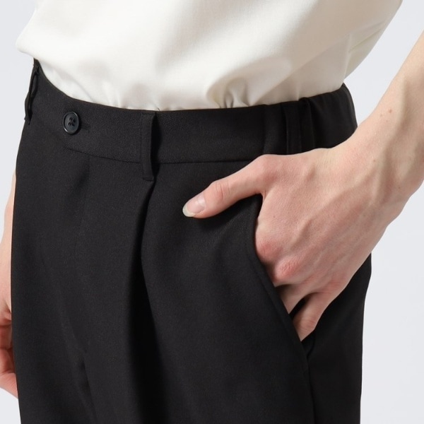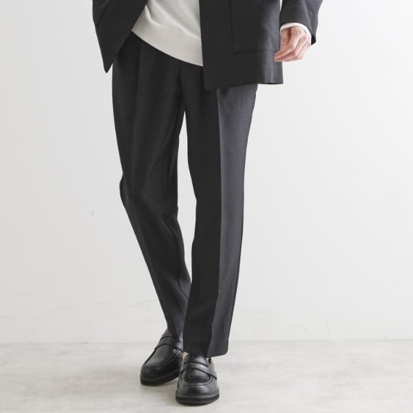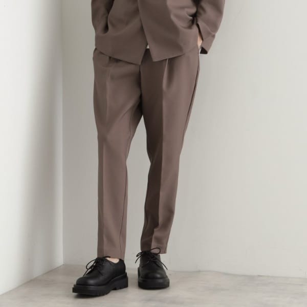 1タックを入れヒップ周りに適度なゆとりを持たせつつ、裾に向かって細くなるワイドテーパードシルエット。