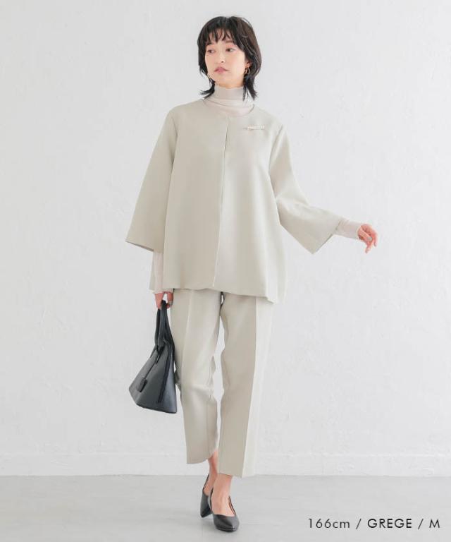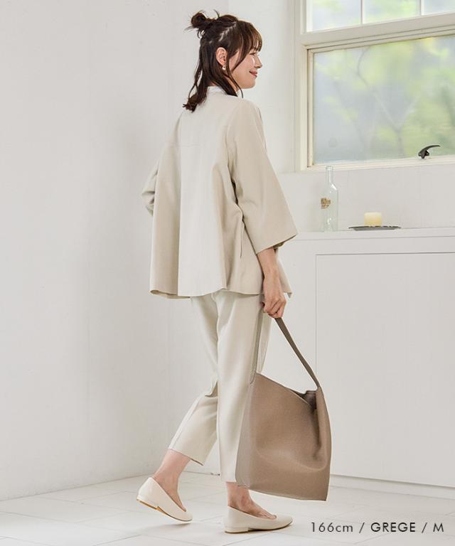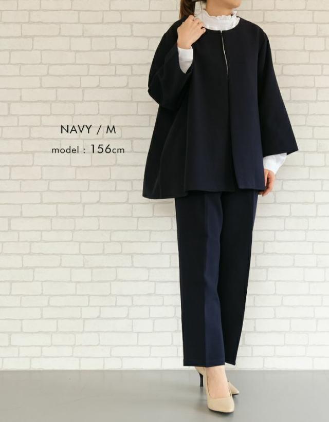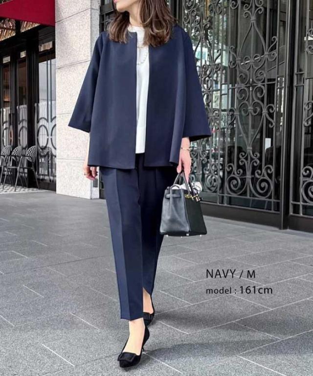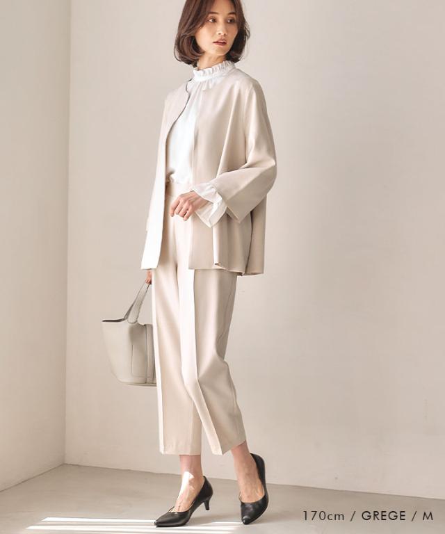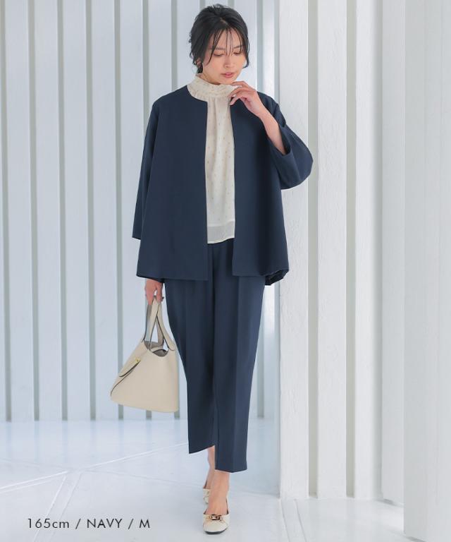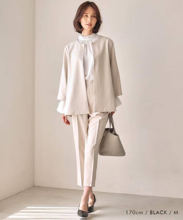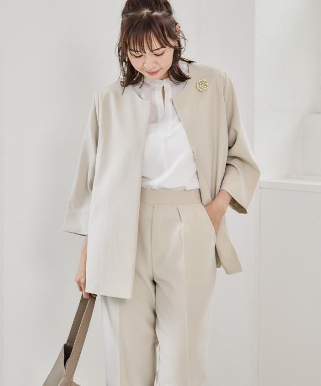 フレアシルエットでこなれ感を演出するセットアップスーツ。 ノーカラーで顔周りをスッキリ見せ、袖丈は抜け感が出るように、手首が見える長さにしました◎ 袖幅もゆったりしているので、中に着るトップスを選ばず、冬はニットを合わせることもできます。 パンツは楽ちんなバックゴムで、センタープレスで脚長効果も♪ お仕事から学校行事まで、どんなシーンにも活躍してくれます。