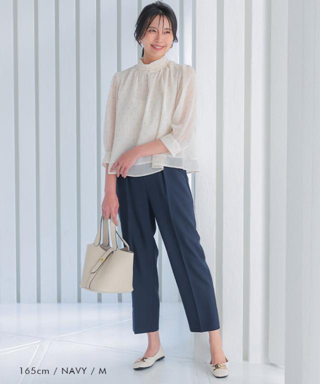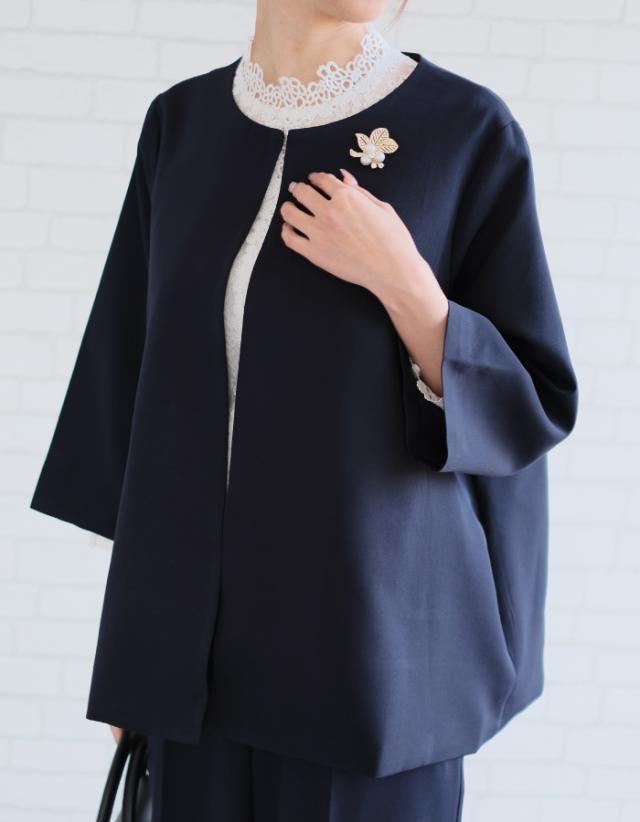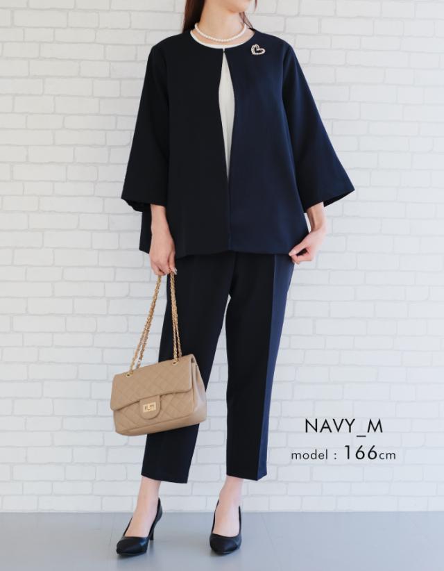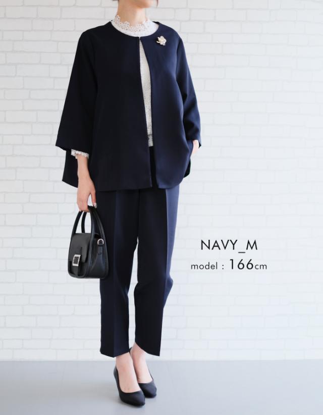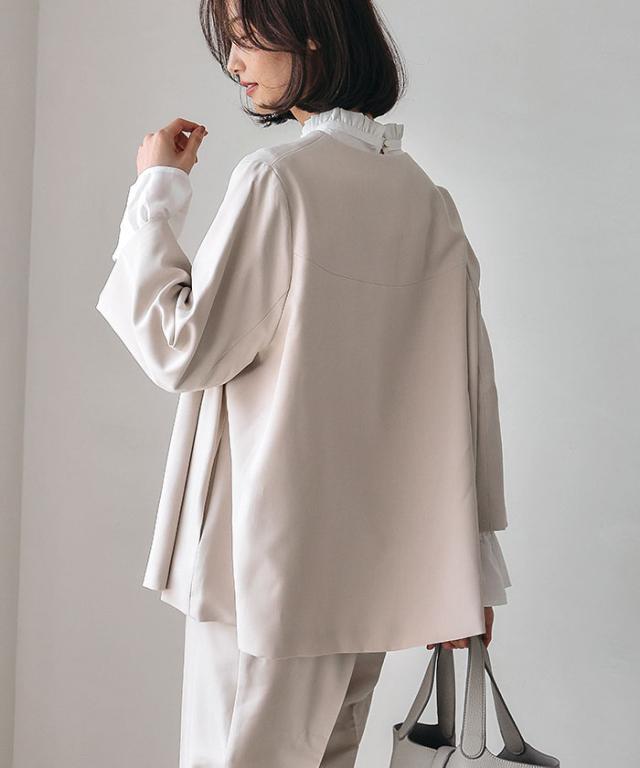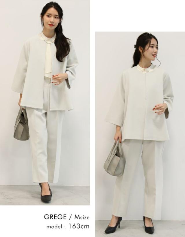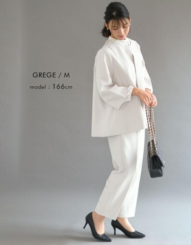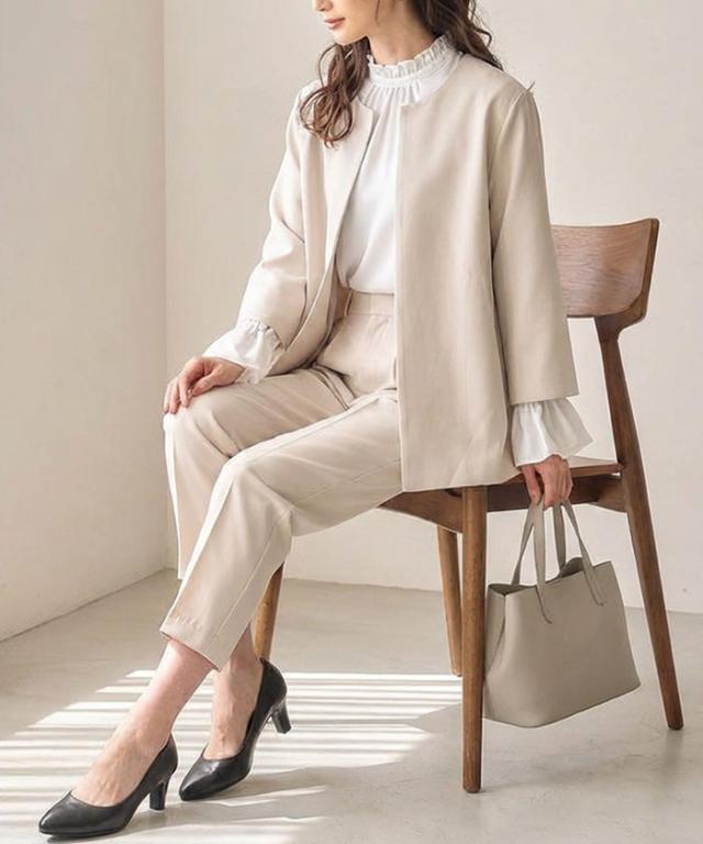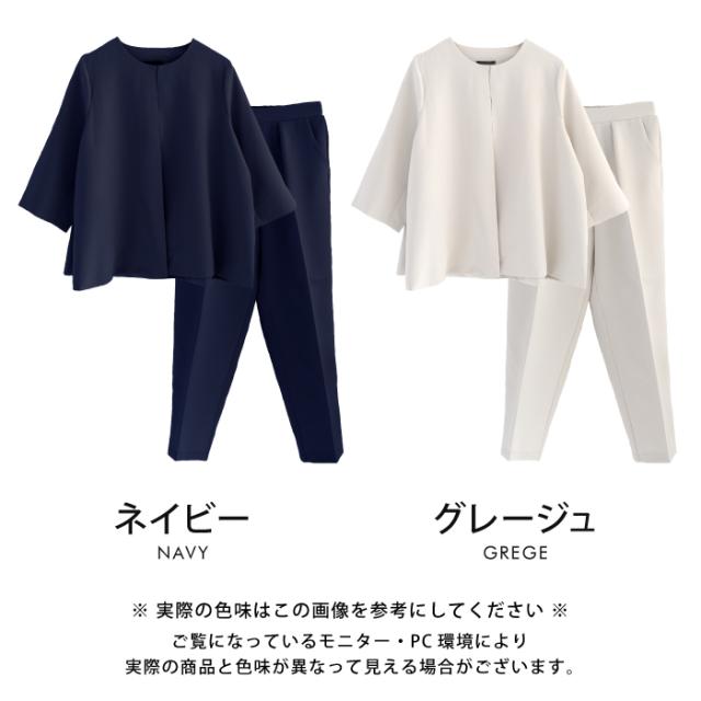フレアシルエットでこなれ感を演出するセットアップスーツ。 ノーカラーで顔周りをスッキリ見せ、袖丈は抜け感が出るように、手首が見える長さにしました◎ 袖幅もゆったりしているので、中に着るトップスを選ばず、冬はニットを合わせることもできます。 パンツは楽ちんなバックゴムで、センタープレスで脚長効果も♪ お仕事から学校行事まで、どんなシーンにも活躍してくれます。