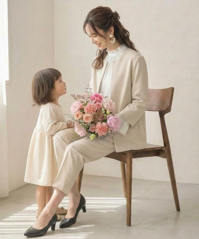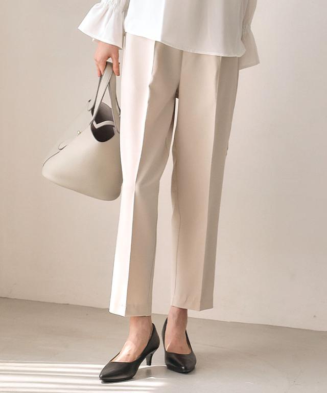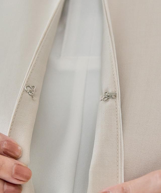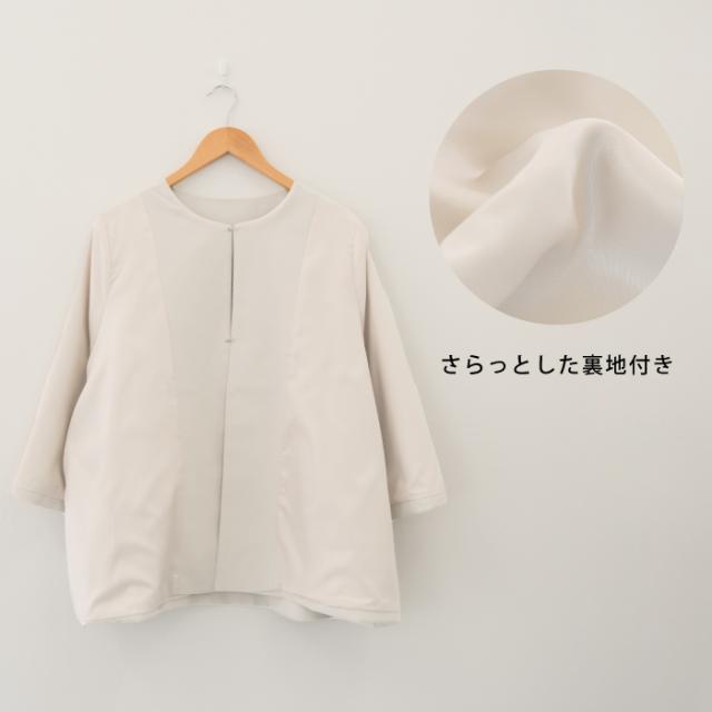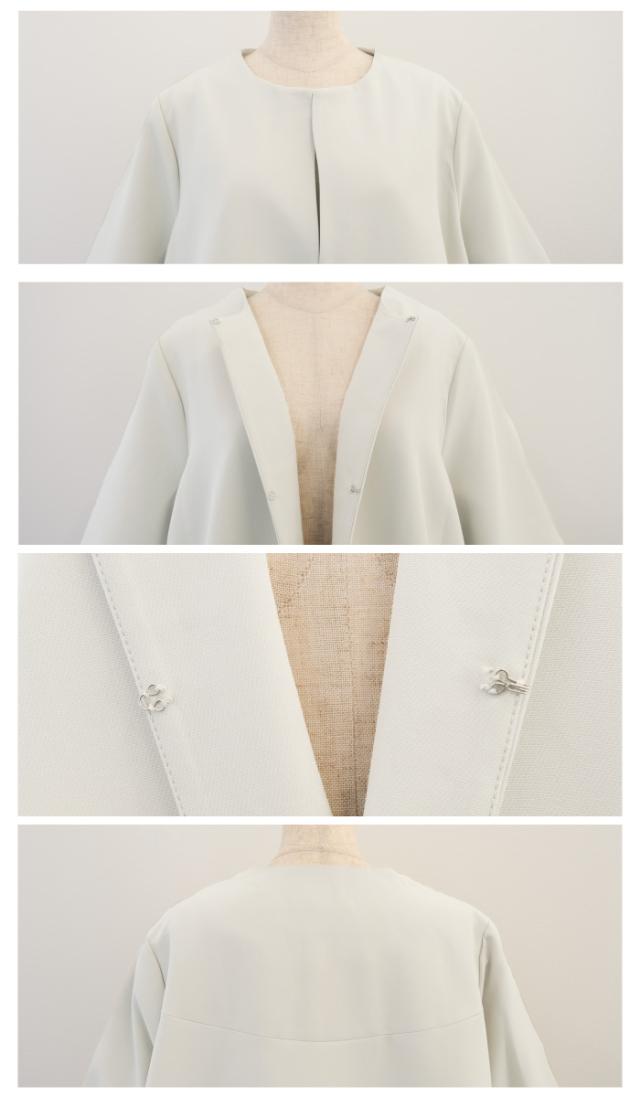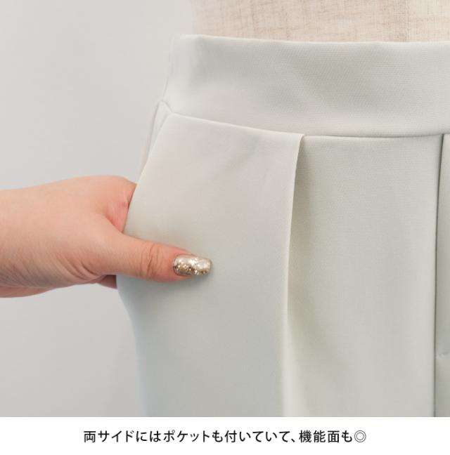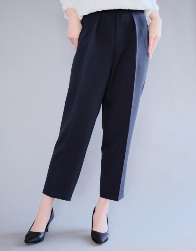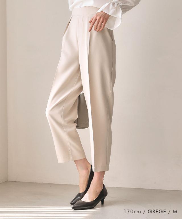 フレアシルエットでこなれ感を演出するセットアップスーツ。 ノーカラーで顔周りをスッキリ見せ、袖丈は抜け感が出るように、手首が見える長さにしました◎ 袖幅もゆったりしているので、中に着るトップスを選ばず、冬はニットを合わせることもできます。 パンツは楽ちんなバックゴムで、センタープレスで脚長効果も♪ お仕事から学校行事まで、どんなシーンにも活躍してくれます。
