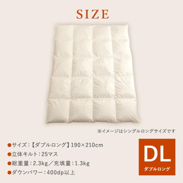 | 【シングルロング】 側生地=ポリエステル85%、綿15% 詰め物=ホワイトダックダウン93%、フェザー10% 1.0kg 【ダブルロング】 側生地=ポリエステル85%、綿15% 詰め物=ホワイトダックダウン93%、フェザー10% 1.3kg |