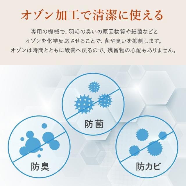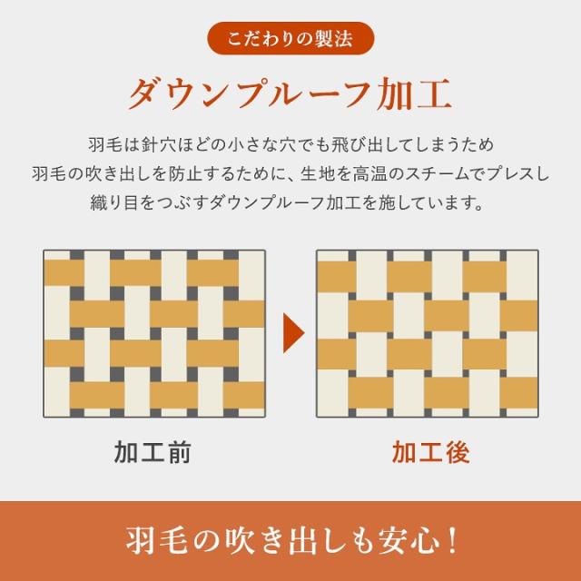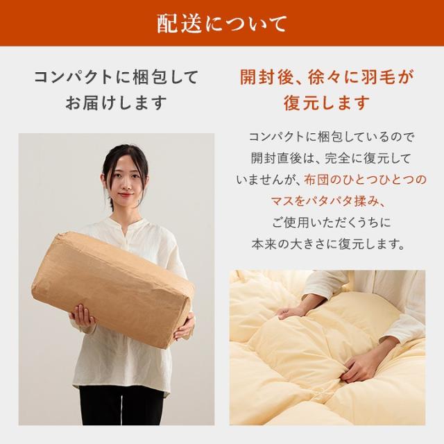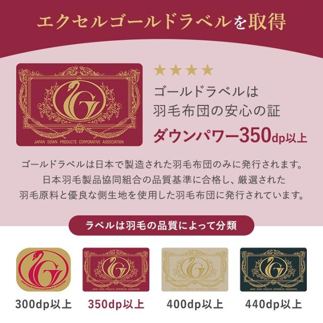 | ■日本羽毛製品協同組合より6段階中の4段階目である「エクセルゴールドラベル」の認定を得た商品です。 ■ダウンパワー350dp以上 ■側生地は完全移動防止キルトでご使用中の羽毛の偏りが無く、いつでも布団の中で均一に羽毛が保たれます。 ■国内パワーアップ加工でふっくら ■側生地は3層構造で温かい空気層を作ります。また上の層と下の層でキルトマスの数が違い外側に温かい空気を逃がしにくい構造になっています。 ■羽毛の産地は「台湾」になります。 ■羽毛は天然素材のため、無臭ではございません。 ■商品の開封直後や温度・湿度等の環境等により臭いを感じる場合がございますので、開封直後には風通しの良い場所での十分な陰干しやお布団を空気を押し出しながら小さく丸めて折りたたみ、その後、広げてしっかり空気を含ませて、お布団の中の空気を入れ換えることをお勧めいたします。臭いは天然羽毛の臭いのため人体に害はございませんのでご安心ください。 ■部分的に側生地が汚れたら、ぬれた布ですぐに拭き取ったり、つまみ洗いなどをし、十分乾燥してください。 |