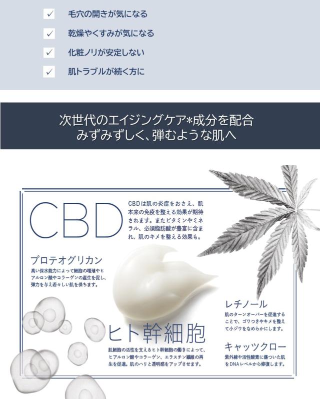 CBDとヒト幹細胞の2つの力を組み合わせた高機能エイジングケアクリームです。年齢とともに肌細胞の成長因子が減少すると、肌本来の力が低下して肌不調の原因に。つややかで弾むような肌を取り戻します。