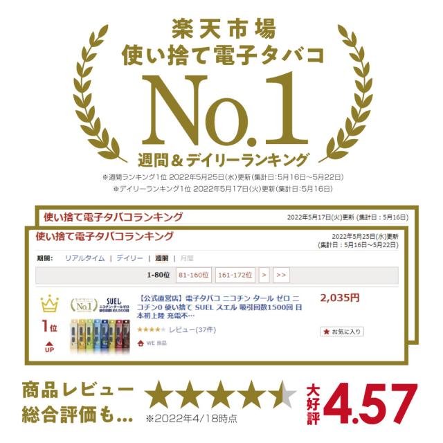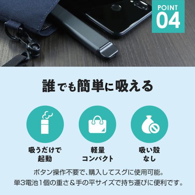 | 濃厚な吸いごたえ!禁煙中に吸える新習慣!! ニコチンゼロ、タールゼロ、嫌な臭いゼロ、リキッド注入ゼロ、メンテナンスゼロ。 届いた日から、これ一つで喫煙が可能◎ 追加でリキッドやフレーバーの準備や充電など、面倒なことは一切なし。 「健康」と「美味さ」を追求した最上級の電子VAPE。 SUELは日本人向けに、健康と美味しさを追求し開発。 濃厚な吸い応えと心地良い煙の量でリフレッシュ。 ?SUEL(スエル)で禁煙中でも吸える新習慣を。 本商品のSUEL(スエル)は約1500回の吸引が可能。紙たばこに換算すると、なんと!約200本(10箱=ワンカートン)分の吸引量となります。 最先端の技術により圧倒的な容量を実現。吸引ができなくなるまで風味を損ないません。 ニコチンゼロ×タールゼロで健康的にリフレッシュ。嫌な煙草臭はもちろん、歯の黄ばみ、部屋の黄ばみも発生しません。 ニコチン等の有害物質が含まれていないか厳しく検査済み。減煙や禁煙をしたい方にお勧めです。 余計な手間やストレスゼロ。 リキッド追加、充電、掃除。全部不要! 加熱式タバコのようなリキッドの交換や充電は一切不要。吸いたいときに直ぐ喫煙可能です。 ボタン操作も一切なし♪ 吸う動作だけで起動してくれて吸い殻もナシ。軽量かつコンパクトなのでポケットに収納したり、持ち運びにも便利です。 ニコチン0、タール0だからタバコの嫌な臭いも副流煙もゼロ。 周囲の人に迷惑をかけることなく様々なシーンで楽しめます。 ヤマト「ネコポス」配送対応! ※配送日指定がない場合は「ネコポス」での配送になります。 |