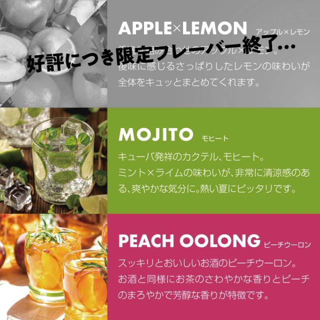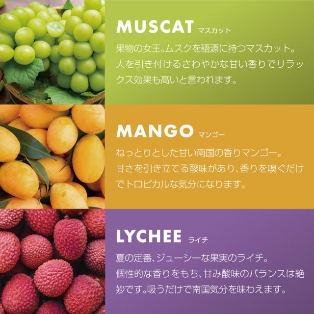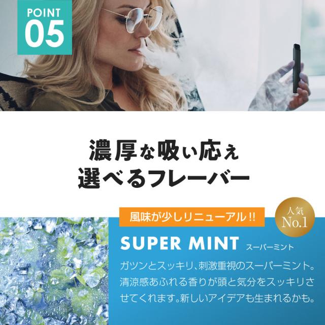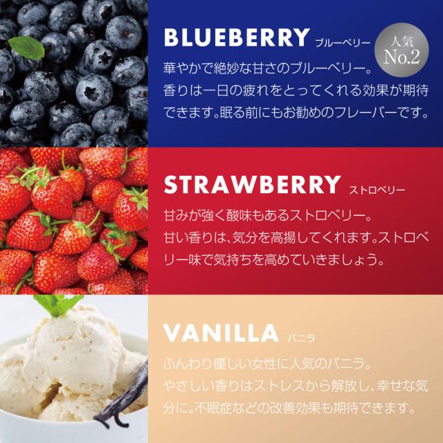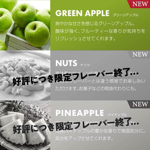 | 1.SUPER MINT(スーパーミント)ガツンとスッキリ。刺激重視のメンソール。 2.BLUEBERRY(ブルーベリー) 爽やかで絶妙な甘さのブルーベリー。 3.STRAWBERRY(ストロベリー) 甘味が強く酸味もあるストロベリー。 4.VANILLA(バニラ) ふんわり甘くやさしい。女の子に人気のバニラ。 5.MANGO(マンゴー) 酸味と甘みがトロピカル気分のマンゴー。 6.MASCAT(マスカット) 芳醇な甘さ溢れる果物の女王。マスカット。 7.LYCHEE(ライチ) ジューシーで甘みと酸味が絶妙。ライチ。 8.MOJITO(モヒート)ミントとライムの清涼感で暑い夏にピッタリ。モヒート。 9.PEACHOOLONG(ピーチウーロン)さわやかな香りと芳醇な香りが特徴。ピーチウーロン。 10.MIX BERRY(ミックスベリー)甘味と酸味のバランスが良い。ミックスベリー。※NEW 11.BLACK MINT(ブラックミント)爽快な香りで気分スッキリ。ブラックミント。※NEW 12.GREEN APPLE(グリーンアップル)酸味が強く、フルーティーな香り。グリーンアップル。※NEW |