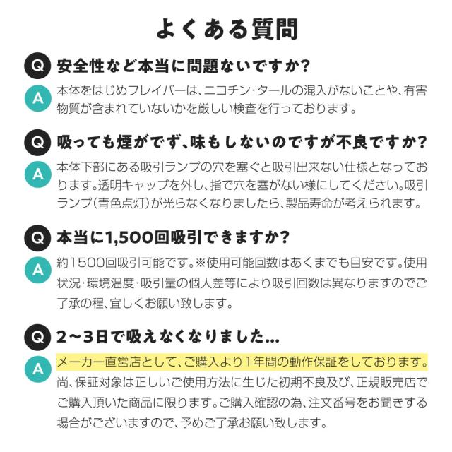 | Q. ニコチン・タールゼロと記載されていますが、安全性などは本当に問題ないですか? A. 本体をはじめフレイバーは、ニコチン・タールの混入がないことや、ホルムアルデヒド、アセトアルデヒド等の有害物質が含まれていないかを厳しい検査を独自に行っております。 Q. 吸っても煙が出てこず、味もしないのですが不良品でしょうか? A. 本体下部にある吸引ランプの穴を塞ぐと吸引できない仕様となっております。透明キャップを外し、指で穴を塞がない様にご使用ください。 吸引ランプ(白色点灯)が光らなくなりましたら、製品寿命が考えられます。 |