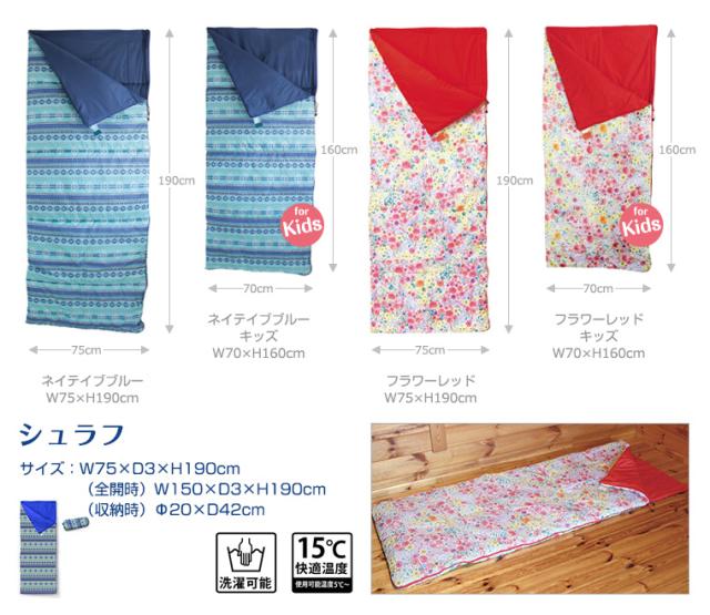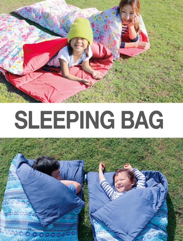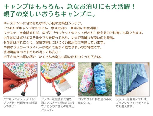 【特徴】キッズテントに合わせたかわいい柄の封筒型シュラフ。ファスナーを開き、1枚に広げてブランケット代わりに使うこともできます。
