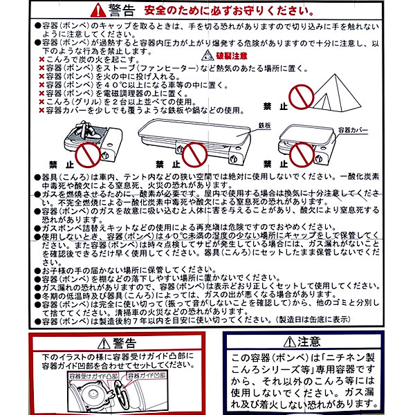 この容器(ボンベ)は「ニチネン製こんろシリーズ等」専用容器ですから、それ以外のこんろ等には使用しないでください。ガス漏れ及び着火しない恐れがあります。