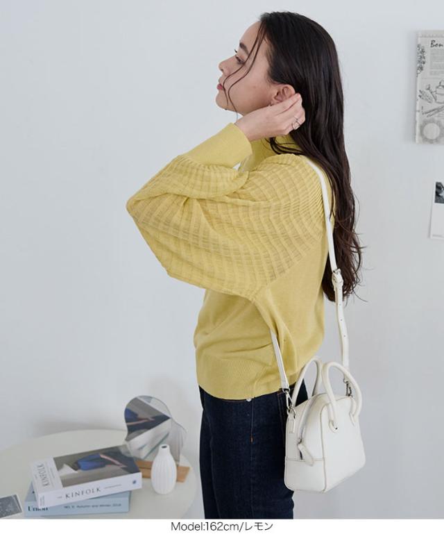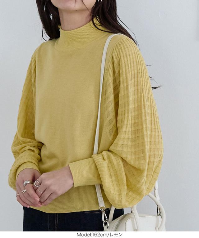 春新作 シアーチェックスリーブニットトップス C6603 入荷済 レディース 長袖 ボリュームスリーブ ぽわん袖 10分袖 シアー モックネック ゆったり カラーニット 30代 40代