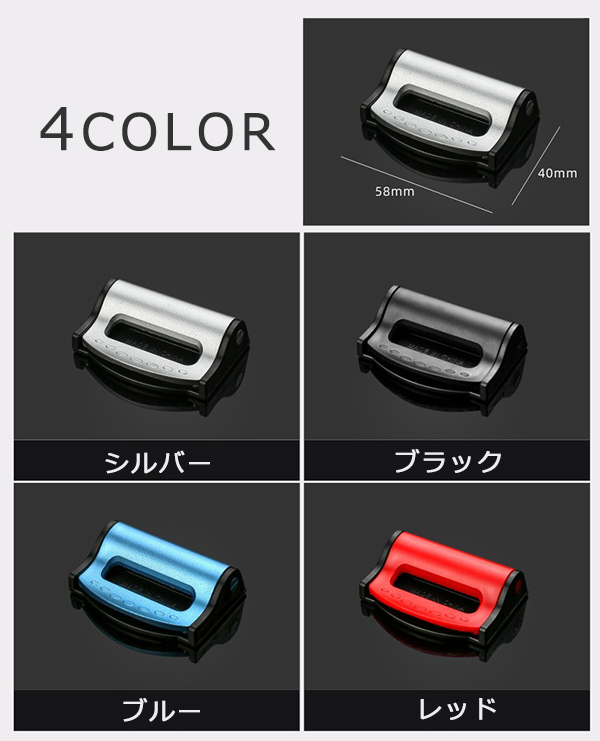 シートベルトストッパーで、快適なドライブ体験を手に入れよう! 長時間の運転で、シートベルトの締め付けや圧迫感を感じたことはありませんか? 特に、お腹周りやおなかの張っている妊婦さんには、シートベルトが苦しく感じる場合も多いですよね。 そんな時に役立つのが、シートベルトストッパーです。 シートベルトストッパーがあれば・・・ ・好きな位置でベルトを固定できるので、圧迫感を軽減できます。 ・ワンタッチで簡単に調整できるので、運転中でも楽々操作できます。 ・この商品を使うことで・・・ 1. 長時間の運転も、快適に過ごせるようになります。 以前は、シートベルトの締め付けがきつくて、長距離のドライブが辛かった。でも、 シートベルトストッパーを使うようになってからは、好きな位置でベルトを固定できるので、 長時間運転しても快適に過ごせるようになりました。 2. お腹周りの圧迫感がなくなり、リラックスして運転できます。 妊娠中に、お腹が大きくなってくると、シートベルトが苦しく感じていました。 でも、シートベルトストッパーを使うようになってからは、お腹周りの圧迫感がなくなり、 リラックスして運転できるようになりました。 3. 子供も、シートベルトを嫌がらなくなるはず。 子供は、シートベルトを締められると嫌がって、ぐずることが多かったです。でも、 シートベルトストッパーを使うようになってからは、好きな位置でベルトを固定できるので、 子供もぐずることなく、快適に車に乗れるようになりました。 シートベルトストッパーがあれば、・・・ ・長時間の運転でも、快適に過ごせるようになります。 ・お腹周りの圧迫感がなくなり、リラックスして運転できます。 ・子供も、シートベルトを嫌がらなくなります。 ・もう、シートベルトの締め付けや圧迫感で悩む必要はありません! シートベルトストッパーを手に入れて、快適なドライブ体験を手に入れませんか? 商品詳細 サイズ:(約)5.8cm×4.1cm×1.7cm カラー: ブラック レッド ブルー シルバー 【注意事項】 ※本商品には説明書が付属しておりません。使用方法に関しては商品ページをご参照ください。 ※商品画像はご覧になっているモニターやPCなどの環境、解像度により、 実物と多少カラーが異なる場合がございます。色味やサイズが異なるなどのクレームはご対応致しかねますので、予めご了承ください。 ※輸送中に外装に傷やへこみが起こる場合がございますが、商品に影響はございませんので、予めご了承のもとお買い求めください。 ※本商品は海外からの輸入品ですので、細かい傷や汚れなどある場合がございます。予めご了承のもとお買い求めください。 ※こちらの商品は安価にご提供するため、簡易包装、簡易パッケージとなっております。 ※本商品を使用した事による、直接もしくは間接的に生じた損害、事故、怪我について当店は一切の責任を負いません。 ※取り付けの際には、シートベルトが緩すぎないか、危険でないかをご確認いただいてからご使用ください。 ※本商品に傷、歪み、破損などがあった場合には怪我、事故の恐れがありますので、直ちに使用を中止し破棄してください。 ※本商品はシートベルトストッパーとして使用するものであり、本来の目的と違う使い方をしますと事故、 故障、破損の恐れがございますので、本来の目的以外での使用はしないでください。 |