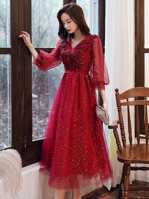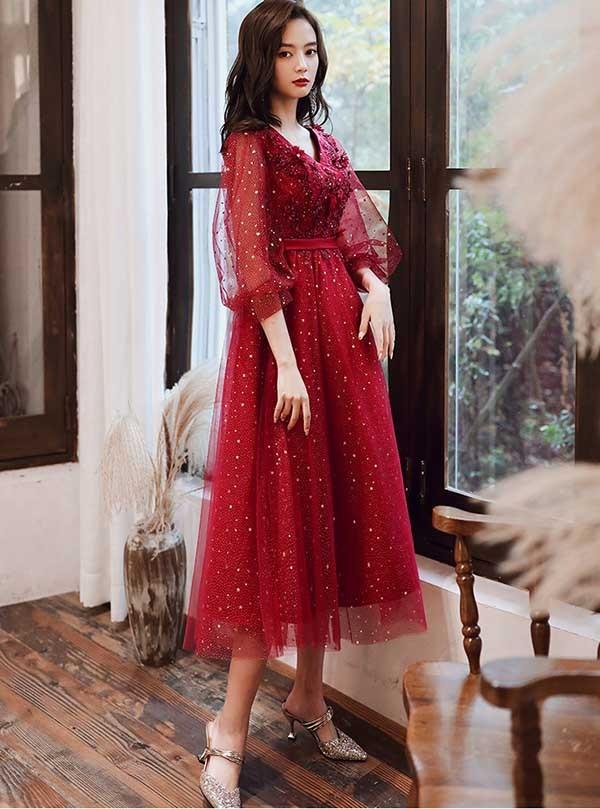 ドレス 大人 ピアノ発表会 ドレス 演奏会 結婚式 袖付き キラキラ フェミニン パーティードレス ロングドレス 袖あり お呼ばれ 20代 30代 可愛い フェミニン ワインレッド dv088zezela