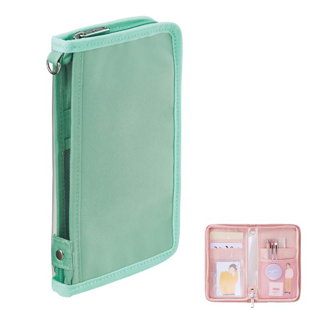 推し活グッズの持ち運びに便利!付属の透明シートをデコレーションすると自分だけのオリジナルデザインのポーチが作れます。大きめのアクスタや缶バッジ・カード(トレカ・会員証など)・L版写真・ペンが入れられます。内側は中身が見える透明ポケットとトレカや会員証が入る不透明ポケット、ペンなどが入る深めポケット、缶バッジが取り付け可能なメッシュポケットが付いています。本体背上部にはストラップが付けられるD型リング付きです。推し活グッズ以外にもカードポーチやペンケース、トラベルポーチ、通帳ケースとしてもご使用いただけます。
