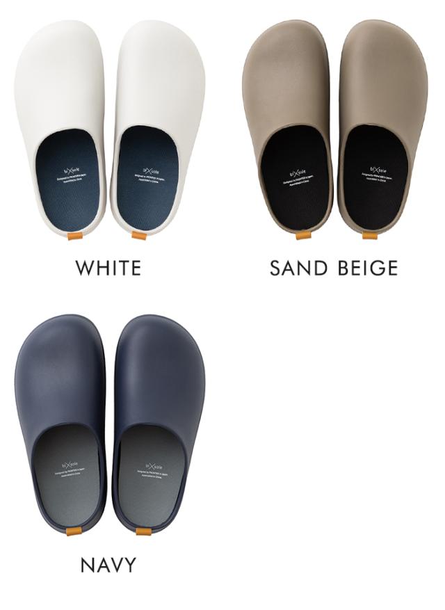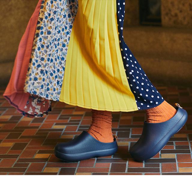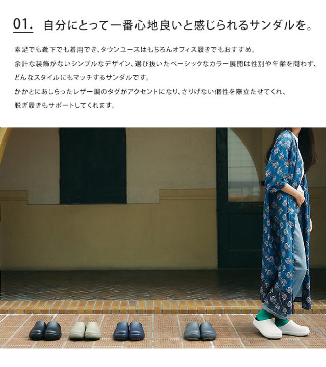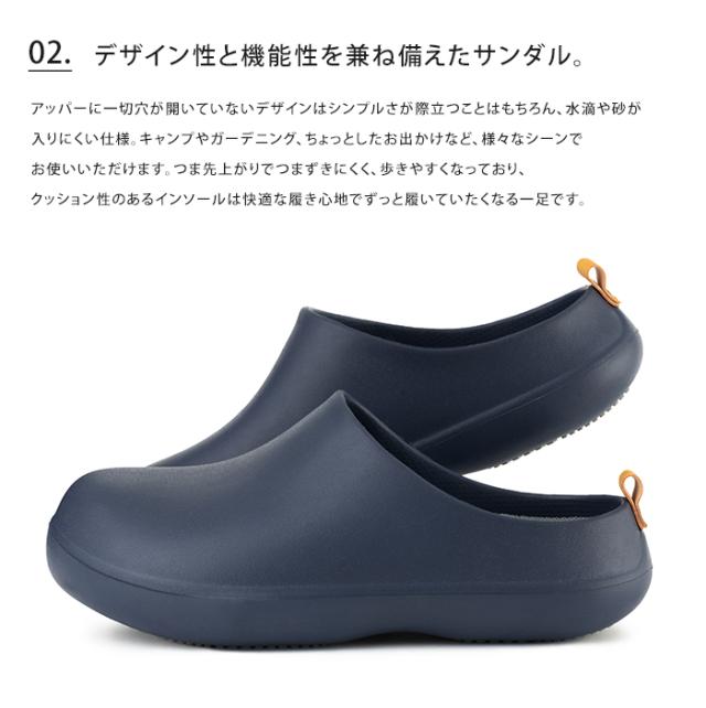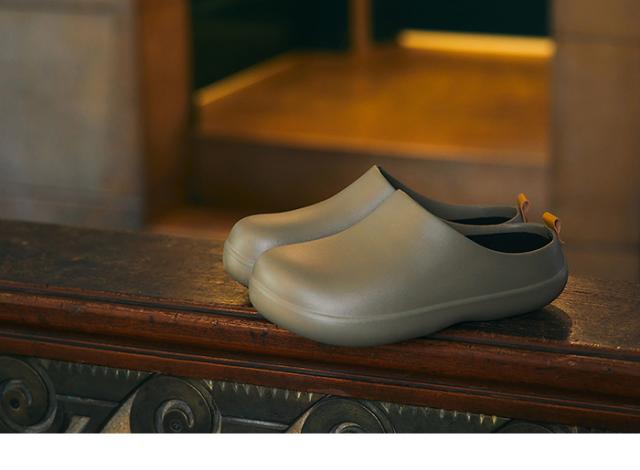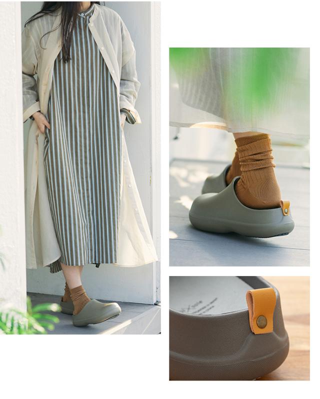 シンプルなデザインで街にも溶け込む、都会の「ツッカケ」。EVA素材を使用し、軽量でソフトな履き心地を追求しました。シンプルなデザインでサッと履いてどこかへ遊びに行きたくなる一足です。底面の滑り止めをラバー素材にすることでグリップ力を強化しました。またインソールは取り外しができ、水洗い可能に。より清潔にお使いいただけます。雨の日や水回りに強く、アウトドアやキャンプで大活躍します。つま先上がりでつまずきにくく、歩きやすく、かかとにあしらったレザータグが脱ぎ履きをサポートしてくれます。