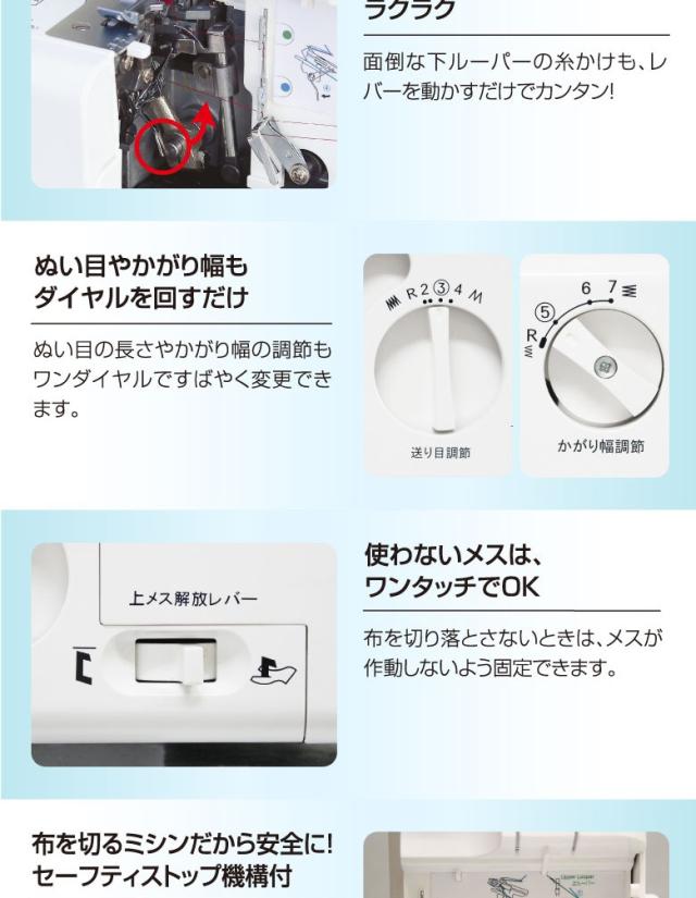 ■ミシン機能:差動送り、カラーガイド、カンタン下ルーパー糸掛け、送り目調節ダイヤル、かがり幅調整ダイヤル、上メス解放レバー、セーフティストップ機構、フリーアーム、巻きロック切り換えレバー、LEDライト