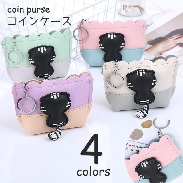 子供用 コインケース 小銭入れ レザー調 カードケース キーホルダー 猫モチーフ バイカラー リング付き 可愛い おしゃれ 小物