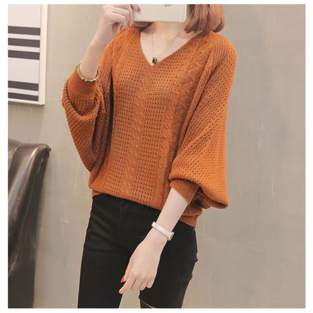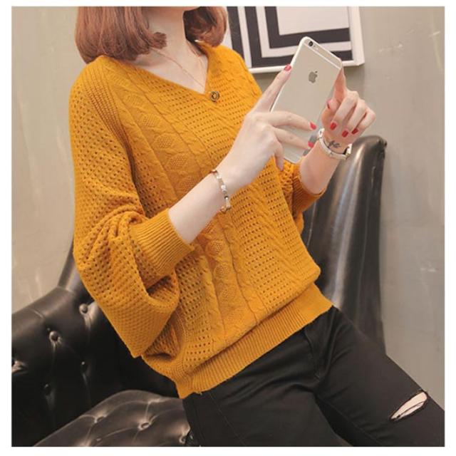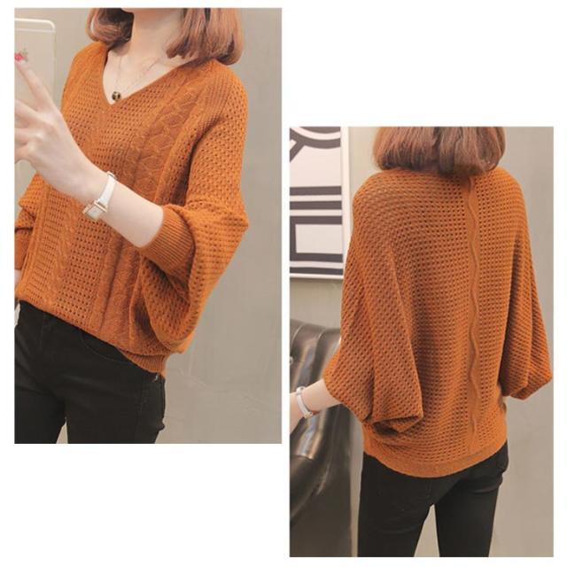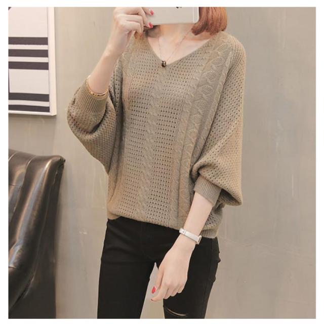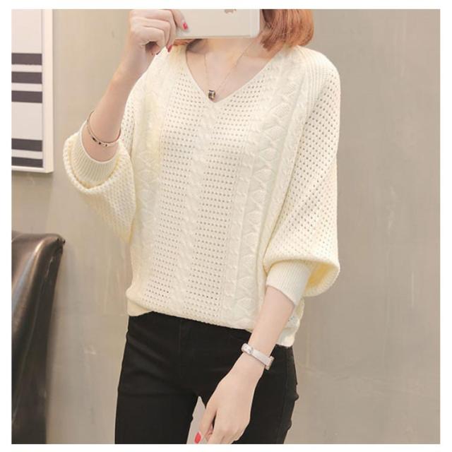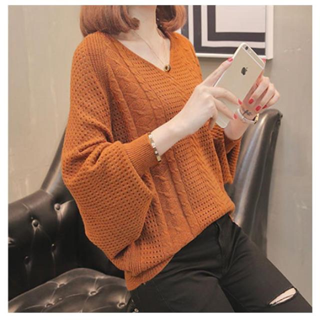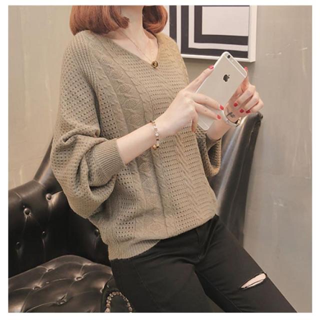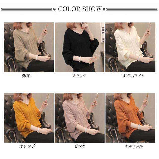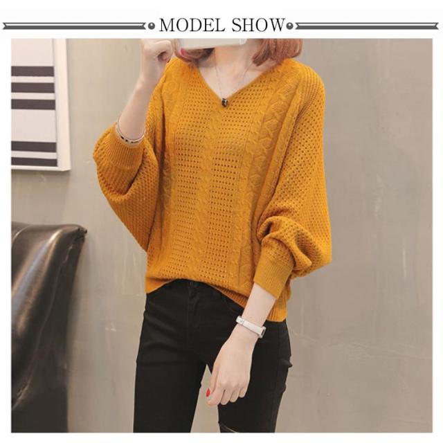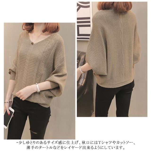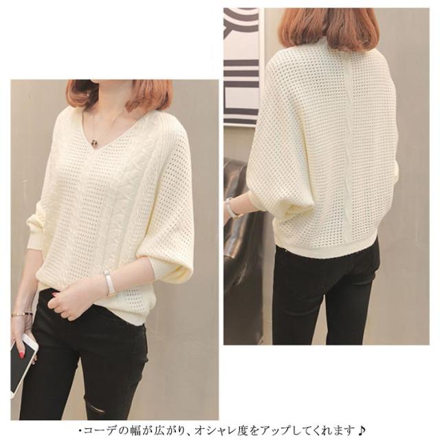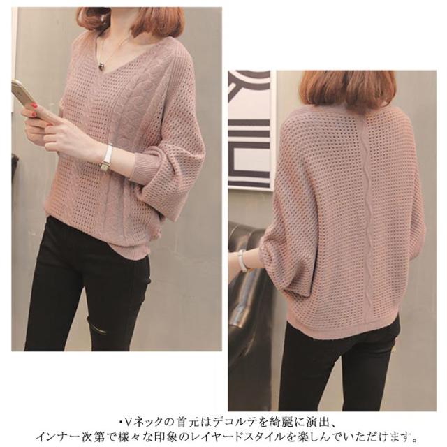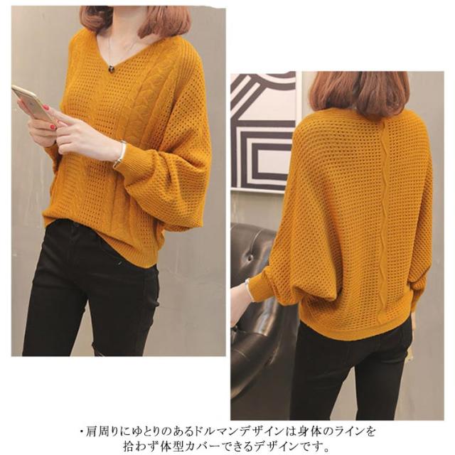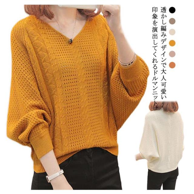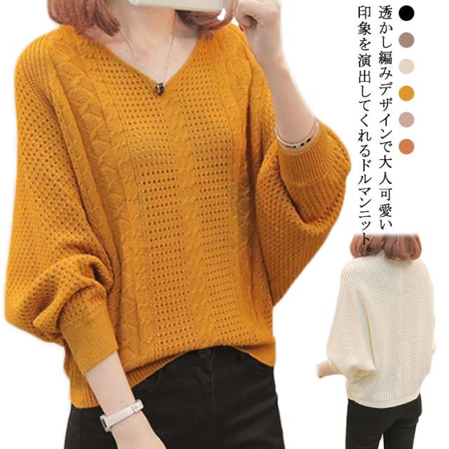 ドルマンスリーブニット 透かし編みデザイン レディース セーター 長袖 Vネック プルオーバー ゆったり 大人カジュアル 抜け感 フリーサイズ 春 秋 無地 全6色