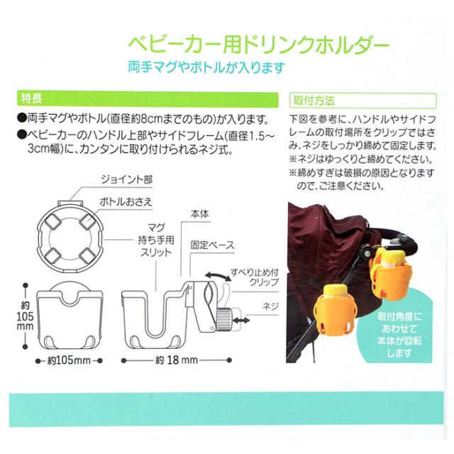 | サイズ | [両手マグ・ボトル適応サイズ] 直径:8cmまで [ベビーカーハンドル上部・サイドフレーム適応サイズ] 直径幅:約1.5cm〜約3cm(ネジで調節可能) [縦]約18cm/[横]約10.5cm/[奥行]約10.5cm ※サイズは当店計測の実寸サイズです。実際の商品ならびにメーカー表記サイズとは多少の誤差が生じる場合がございます。あらかじめご了承ください。 |