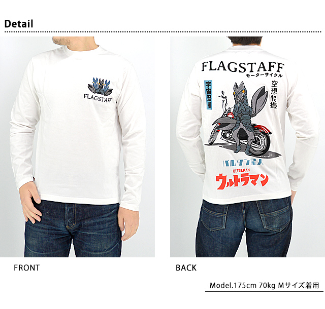 斬新なアイディアとインパクトのあるデザインが魅力的な、絡繰魂の姉妹ブランド【Flagstaff】より、ウルトラマン×FLAG STAFF ロングTシャツ「バルタン星人」(431015)のご紹介です。 大人気作品ウルトラマンシリーズとのコラボレーションが遂に実現! 背中には愛車のそばで佇むバルタン星人を刺繍で描きました。 バックにしっかり柄を入れている分、フロントはシンプルに仕上げ、メリハリを付けました。 アメカジ×ウルトラマンが絶妙に組み合わせられた、Flagstaff拘りの逸品です。 | ||||||||||||||||||||||||||