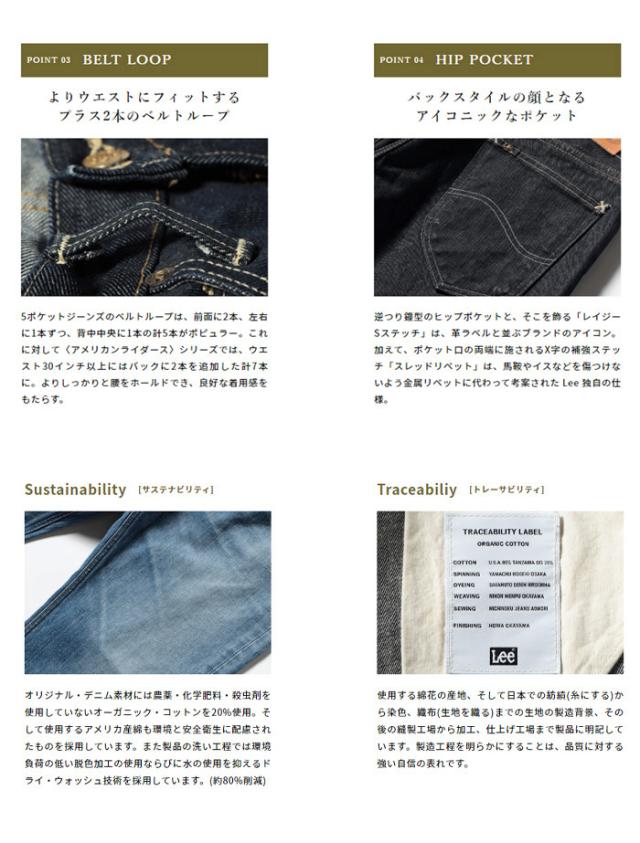 往年のライダースジーンズを現代風にアレンジした日本製本格デニムで、デニム本来の質実剛健さを求めた無骨なデニムパンツ! 1970年代にウエスタンブーツと合わせるジーンズとしてデビューし、当時の流行をリードしたブーツカット。 適度な股上、腰&太腿にフィットし、膝から裾へと広がる流麗なフレアラインが特徴。 30インチからはベルトループも5本から7本にする事でウエストのホールド感がアップ。 逆つり鐘型のヒップポケットと、そこを飾る「レイジーSステッチ」は、レザーパッチと並ぶブランドのアイコン。 加えて、ポケット口の両端に施されるX字の補強ステッチ「スレッドリベット」は、馬鞍やイスなどを傷つけないよう金属リベットに代わって考案された Lee 独自の仕様。 生産はクオリティ重視のメイド イン ジャパン。 フロントポケットの裏地には、使用するコットンの原産国のほか、紡績、染色、織布、縫製まで各工程の担当メーカーを明記したトレーサビリティラベルを配備。 生産背景を開示することは安心を伝えると同時に、ブランドの自信の表れ。 今回のリニューアルでは、Sustainability(サステナビリティ)にフォーカスし、ワンウォッシュの商品は、ドライウォッシュ加工で生感を残した加工施し、通常ワンウォッシュの商品に比べ水量75%の削減。また、色落ちしにくい加工になっている為、洗濯を繰り返しても生感をある程度保つ事が可能になり、製品の寿命を長くする事に成功しました。 濃色の商品は、手作業を機械化しレーザーを使用する事で作業者の負担を軽減し、 本来コスリ部分のメリハリをだす為に手作業で次亜塩素を使用しますが、ここでは次亜塩素を100%カットし一切使用していません。故に、水量も中和工程がなくなるので約500リットルの削減、1本あたり約10リットル、全体の約10%の削減を実現。 淡色の商品は、濃色と同じく、手作業を機械化しレーザーを使用する事で作業者の負担を軽減し、ドライウォッシュ加工を施す事で、本来使用する石を使わずストーンウォッシュ感を出しています。その為、本来であれば汚泥が1回約40kg、1本あたり約1kgの汚泥を削減しています。 更にパワーアップした、こだわり抜かれた1本をぜひお試しあれ。