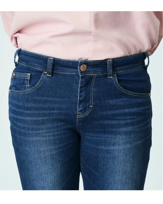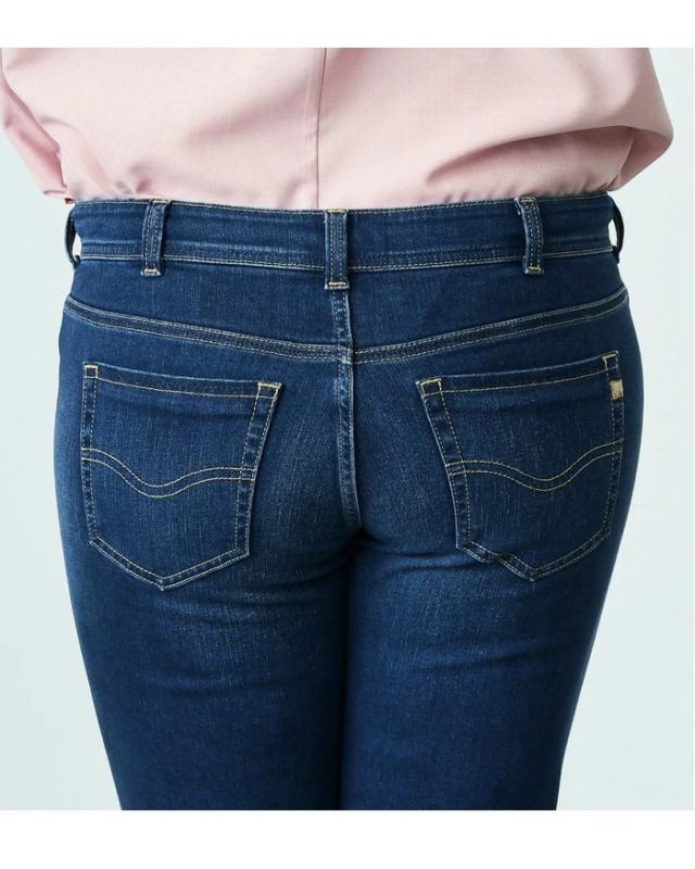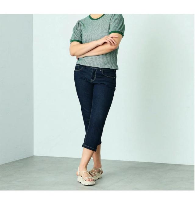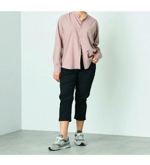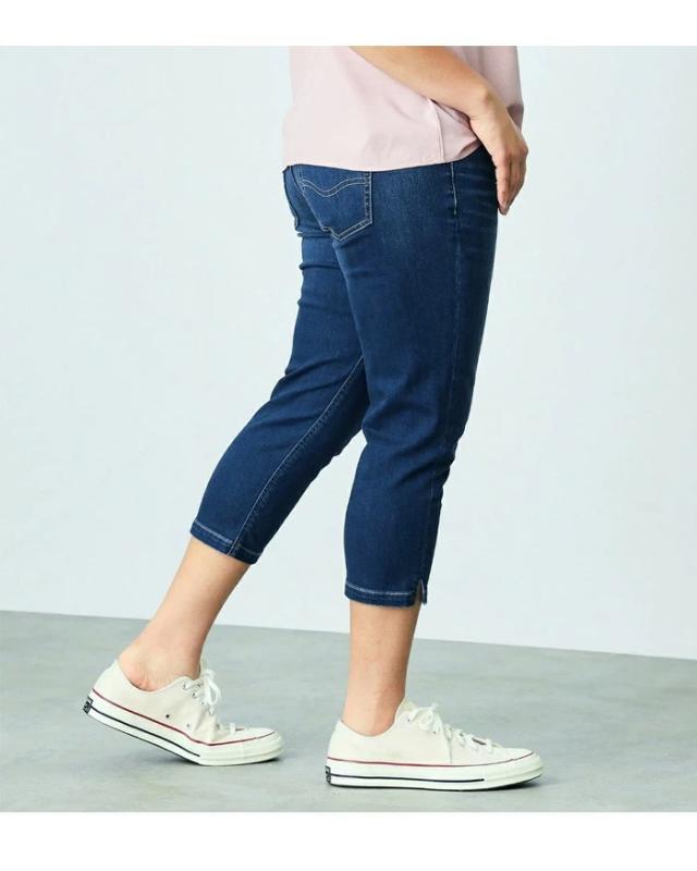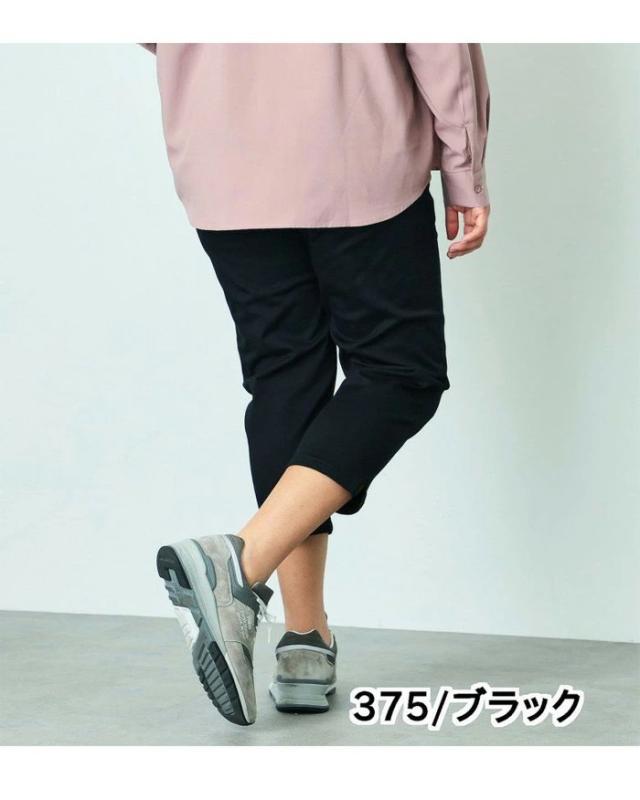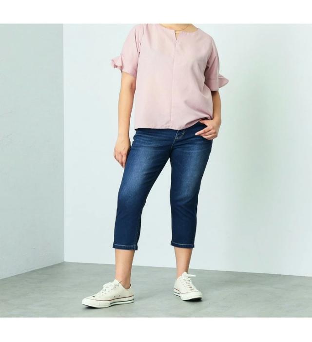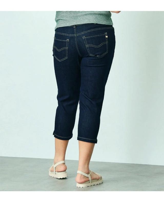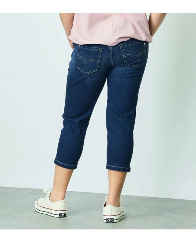 ストレッチ性に優れた、通年快適なデニム・カラー素材を使用。程良い肉厚感とハリ感がある素材で、気になる腰回り・ヒップラインにきれいにフィットします。シルエットは細良い丈感で足首を出し軽やかな印象になるクロップドテーパード。 プラスサイズ専用のパーツと配置バランスを採用し、理想のバランスの後ろ姿を実現しました。 穿き心地の良さにも徹底的にこだわり、膝を絞り過ぎないラインと、ちょうど良い股上設計でノンストレスなフィット感です。 長めのトップスと非常に相性が良く、デイリーユースにぴったりな一本です。