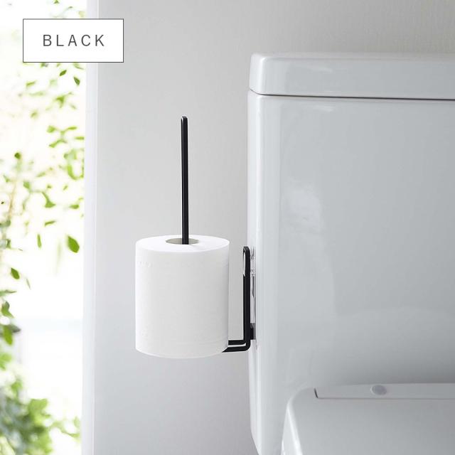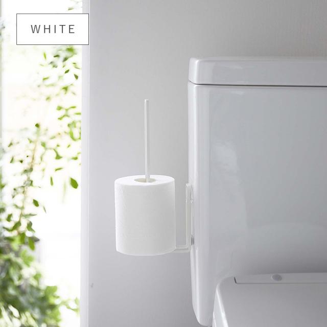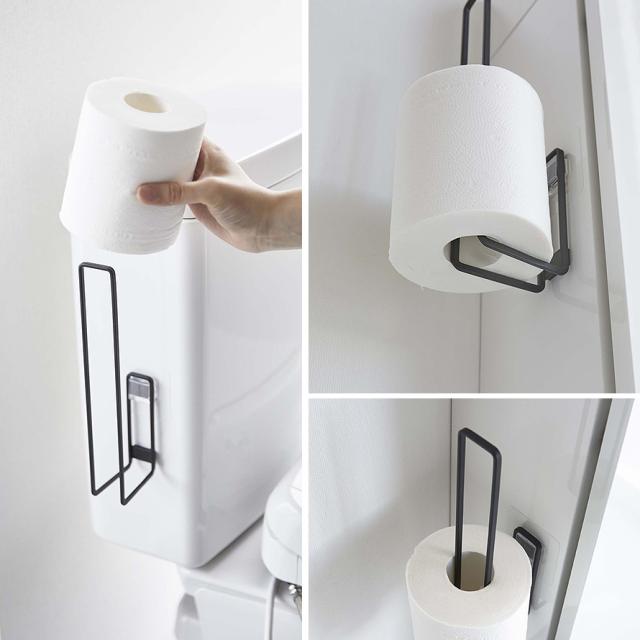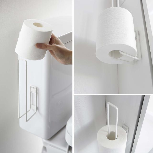 フィルムフックでトイレタンクやタイルに、浮かせて設置できるトイレットペーパーホルダー。トイレットペーパーを差し込むだけの簡単収納。