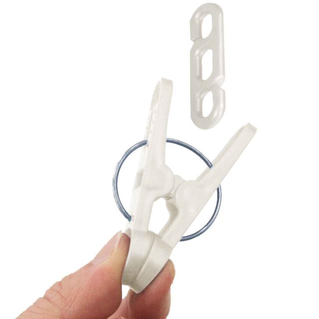 ロープに掛けて使用される場合の横すべり防止ストッパー付です。プラスチック製のピンチは、軽量で使いやすくリーズナブルです。