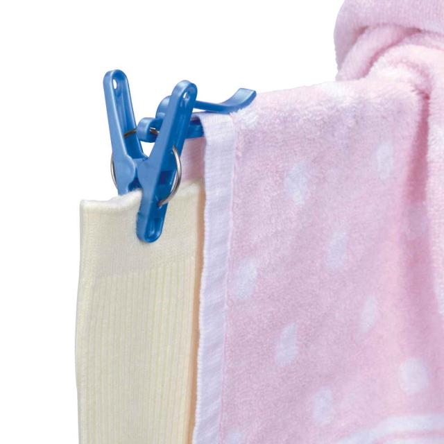 アーム先端に洗濯物をとめるクリップとピンチが付いています。ハンカチ、靴下、小物などが落ちにくくなっています。