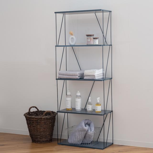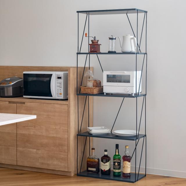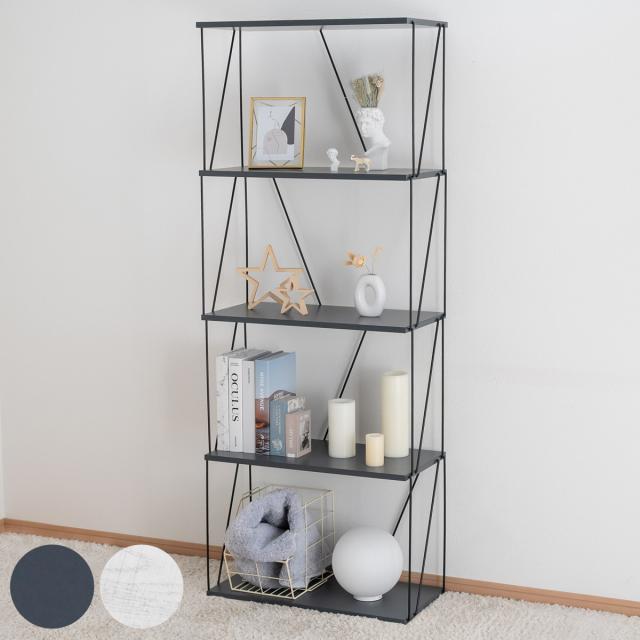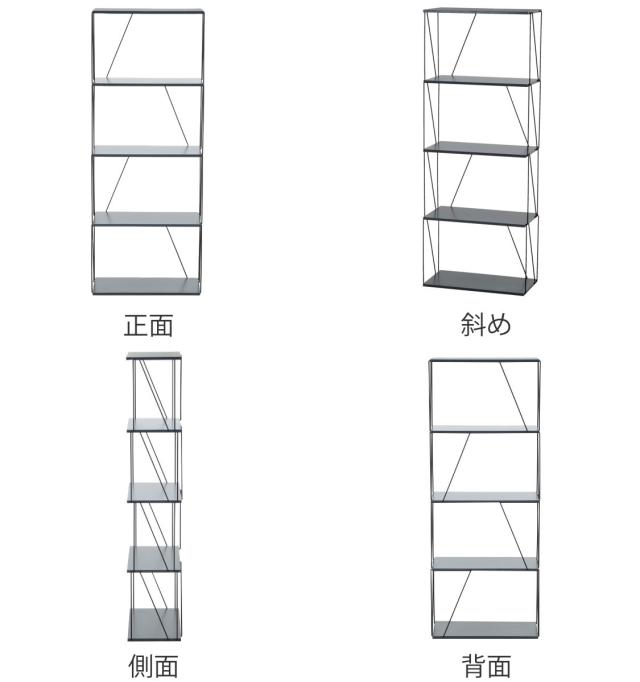 フレームは、圧迫感を感じさせにくい細身のスチールです。背板と側板がないので、飾った小物もしっかりと見せることができます。細身スチール×ブラックカラーが全体を引き締め、スマートな印象です。