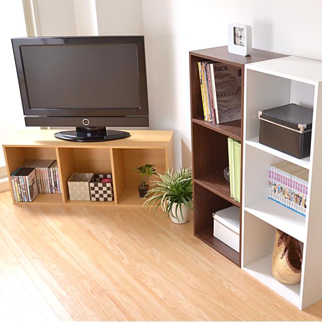 縦置きだけでなく横置きでも設置ができるのでテレビ台やローデスクとして使用することができます。単品としてだけでなく、同色はもちろん色違いで複数台並べたりと色んな使い方が可能です。