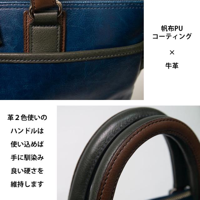 ■帆布にコーティングを施した革のようにも見える撥水性のある軽い素材を使っています ■付属は牛革。ハンドルは2色の革を組み合わせたおしゃれな作りで使ううちに手に馴染み強度にも優れています ■A4ファイル対応サイズ。PC対応ポケットはありませんが15.6インチPCが収納可能。 ■【豊岡鞄】とは【兵庫県鞄工業組合】が定めた基準を満たす企業によって生産され、審査に合格した商品を「豊岡鞄」として認定しています。兵庫県豊岡市は奈良時代から始まる柳細工を起源として千年の歴史を持つかばんの産地です。 ■肩当付ショルダーベルト付 |