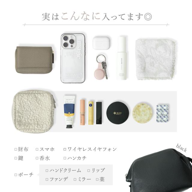 - ほんとにサイズが絶妙!普段持ち歩いている、小さいお財布・目薬、リップ、イヤホンを入れたポーチ・タオルハンカチ・エコバッグがぴったり入ります。 革の質感や、色はとても気に入っています。