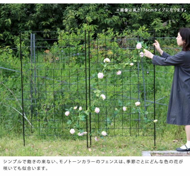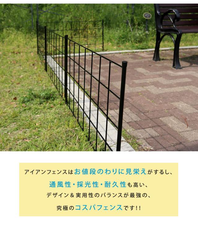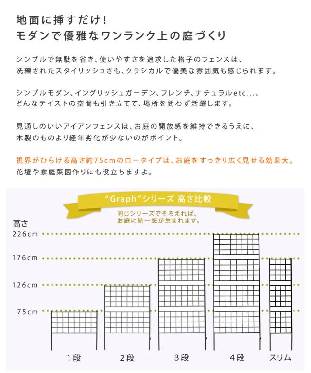 | 地面に挿すだけ! モダンで優雅なワンランク上の庭づくりシンプルで無駄を省き、使いやすさを追求した格子のフェンスは、洗練されたスタイリッシュさも、クラシカルで優美な雰囲気も感じられます。 シンプルモダン、イングリッシュガーデン、フレンチ、ナチュラルetc...、どんなテイストの空間も引き立てて、場所を問わず活躍します。 見通しのいいアイアンフェンスは、お庭の開放感を維持できるうえに、木製のものより経年劣化が少ないのがポイント。 視界がひらける高さ約75cmのロータイプは、お庭をすっきり広く見せる効果大。 花壇や家庭菜園作りにも役立ちますよ。 |