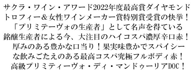 サクラ・ワイン・アワード2022年度最高賞ダイヤモンドトロフィー&女性ワインメーカー賞特別賞受賞の快挙!「プリミテーヴォの生産者」として名声を得ている銘醸生産者による今、大注目のハイコスパ濃厚辛口赤!厚みのある豊かな口当り!果実味豊かでスパイシーな飲みごたえのある最高コスパ究極フルボディ赤!高級プリミティーヴォ・ディ・マンドゥーリアDOC!■さまざまなギフトアイテムをご用意しております。お中元 ギフト 御中元 お盆 お礼 敬老の日 クリスマス 冬ギフト お歳暮 御歳暮 お年賀 御年賀 お正月 年末年始 ご挨拶 バレンタイン ホワイトデー お返し 父の日 母の日 ギフト 贈答品 お土産 手土産 御祝 御礼 内祝い 引き出物 お祝い 結婚祝い 結婚内祝い 出産祝い 出産内祝い 引き菓子 快気祝い 快気内祝い 進学祝い 誕生日祝い バースデーケーキ プレゼント Wedding ウェディング ホームパーティ お花見 パーティ 退職ギフト 退職 就任祝い